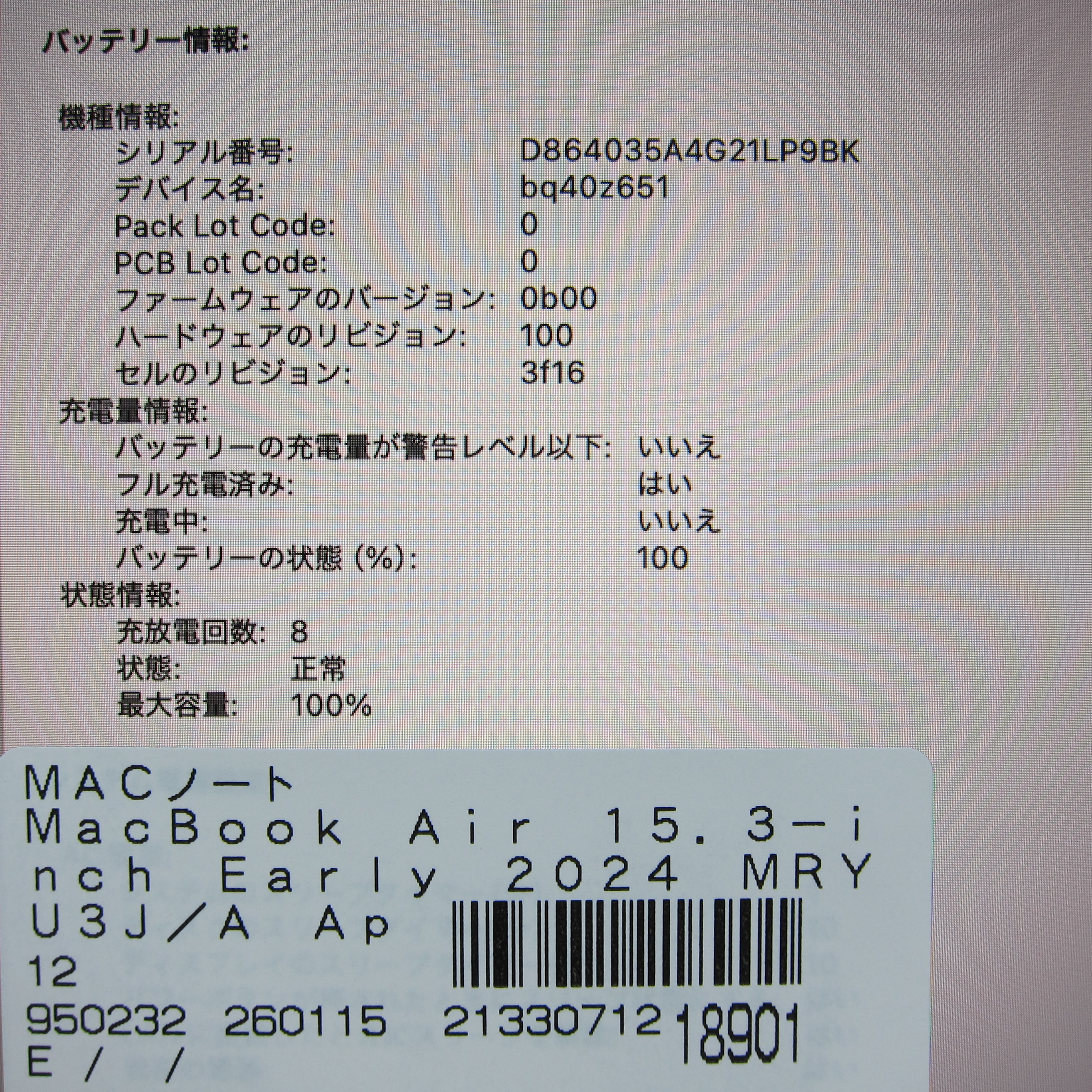 〔中古品〕 MacBook Air 15.3-inch Early-2024 MRYU3J/A Apple M3 8コアCPU_10コアGPU 8GB SSD256GB ミッドナイト 〔15.3 Sequoia〕 [グラフィック:オンボード/JISキーボード]