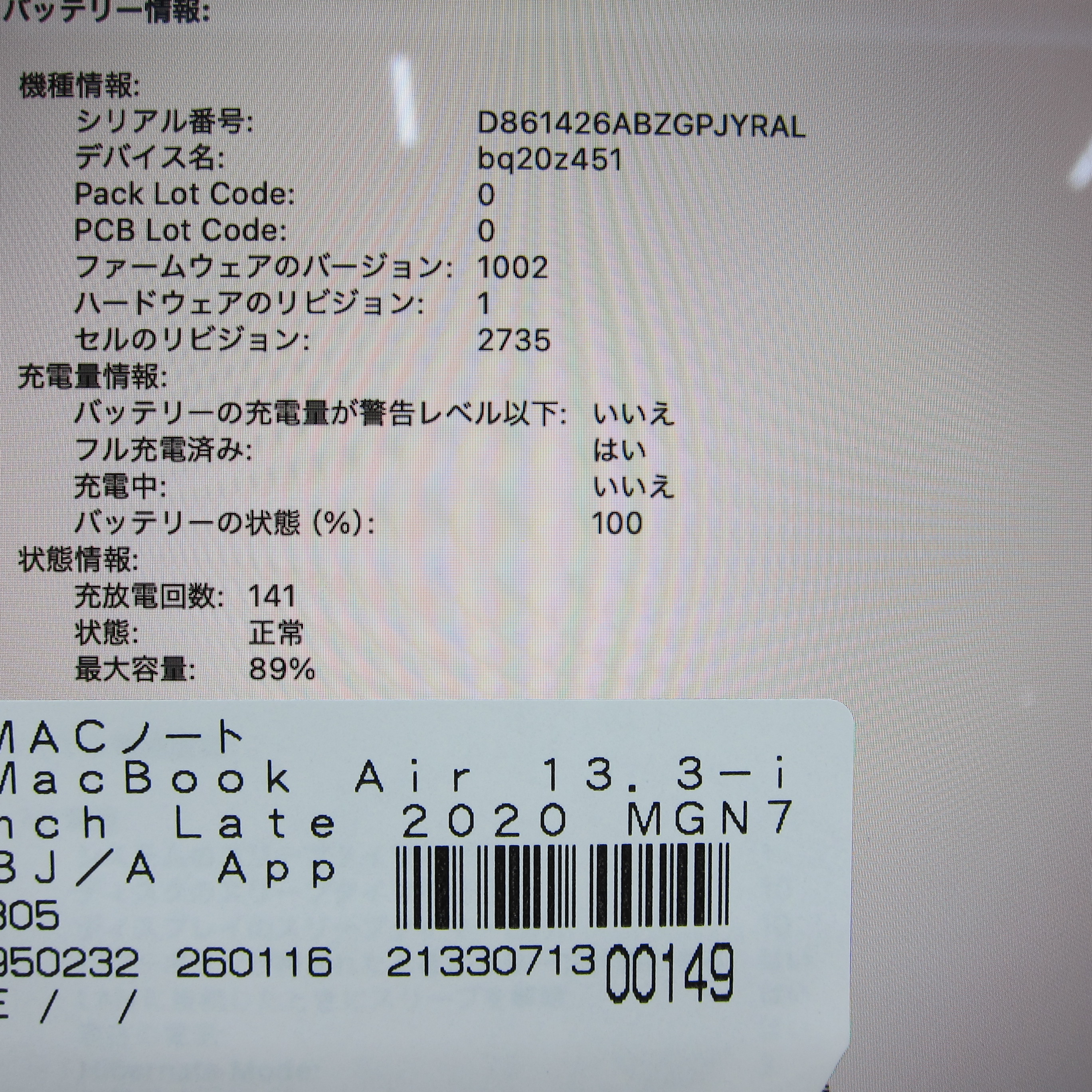〔中古品〕 MacBook Air 13.3-inch Late-2020 MGN73J/A Apple M1 8コアCPU_8コアGPU 16GB SSD2TB スペースグレイ 〔15.3 Sequoia〕 [グラフィック:オンボード/JISキーボード]