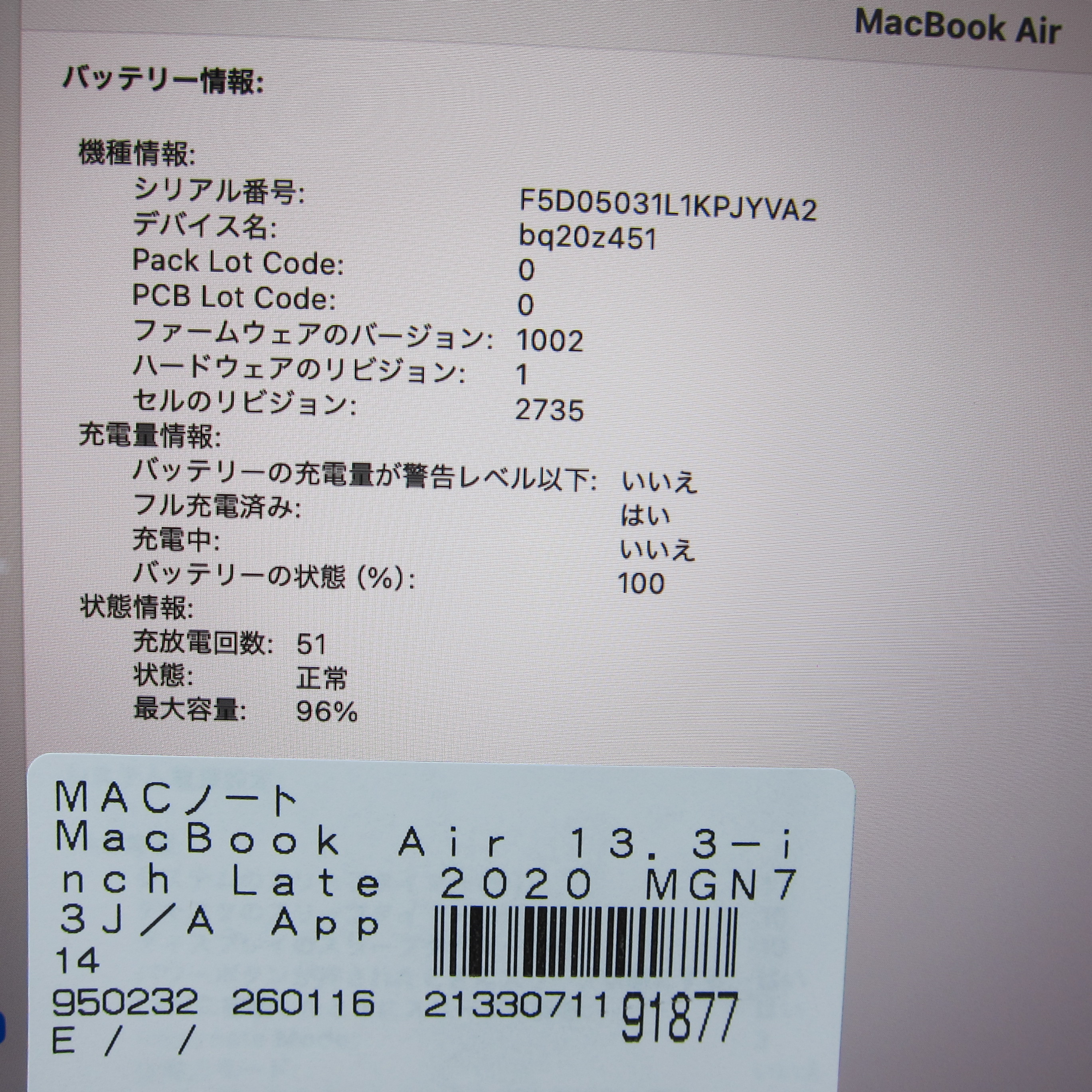 〔中古品〕 MacBook Air 13.3-inch Late-2020 MGN73J/A Apple M1 8コアCPU_8コアGPU 16GB SSD1TB スペースグレイ 〔15.7 Sequoia〕 [グラフィック:オンボード/USキーボード]