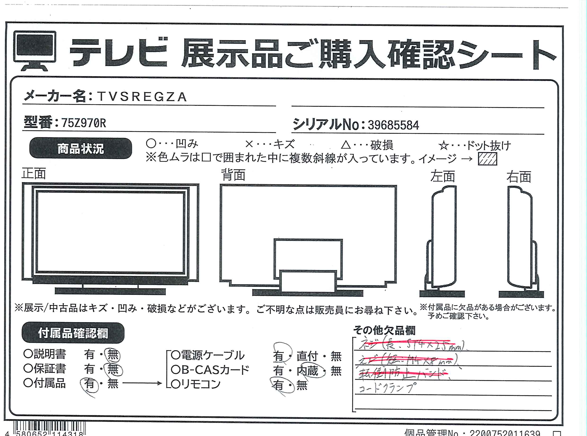 中古商品ランクについて 付属品・商品状態について 〔付属品〕支柱、スタンドベース、スタンド組立・取付ネジ(M5×16mm)×8、リモコン(CT-90506)、単四形乾電池×2、電源コード、ネジ(長:ST4×25mm)、ネジ(短:M4×8mm)、転倒防止バンド