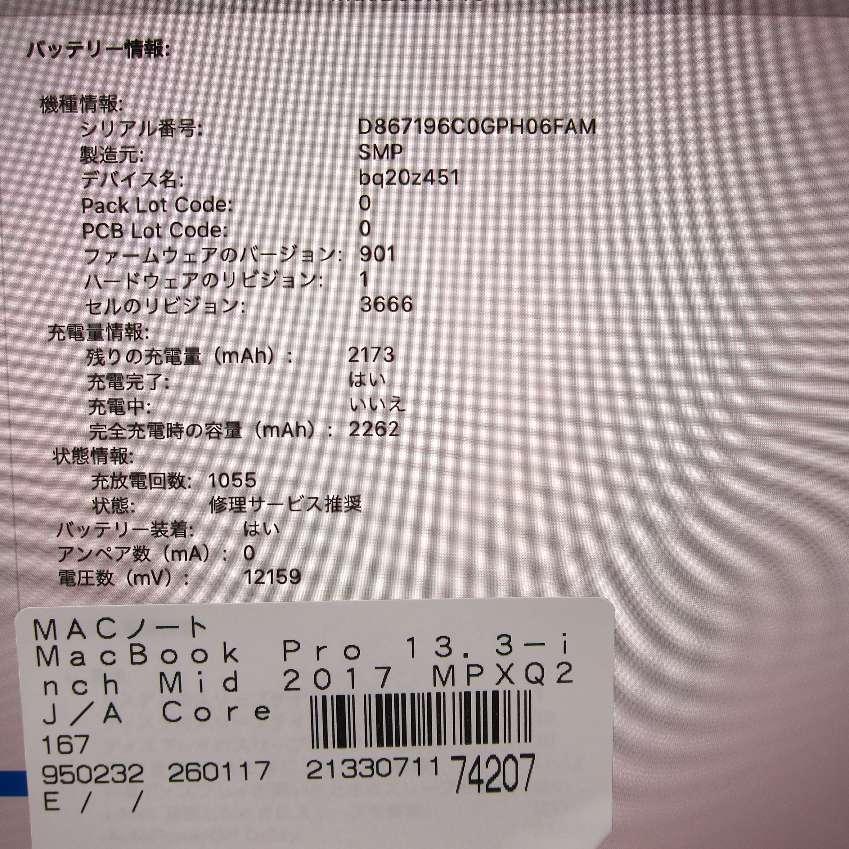 〔中古品(難あり)〕 MacBook Pro 13.3-inch Mid-2017 MPXQ2J/A Core_i5 2.3GHz 8GB SSD128GB スペースグレイ 〔10.15 Catalina〕 [グラフィック:Intel Iris Plus Graphics 640(CPU内蔵)/JISキーボード]