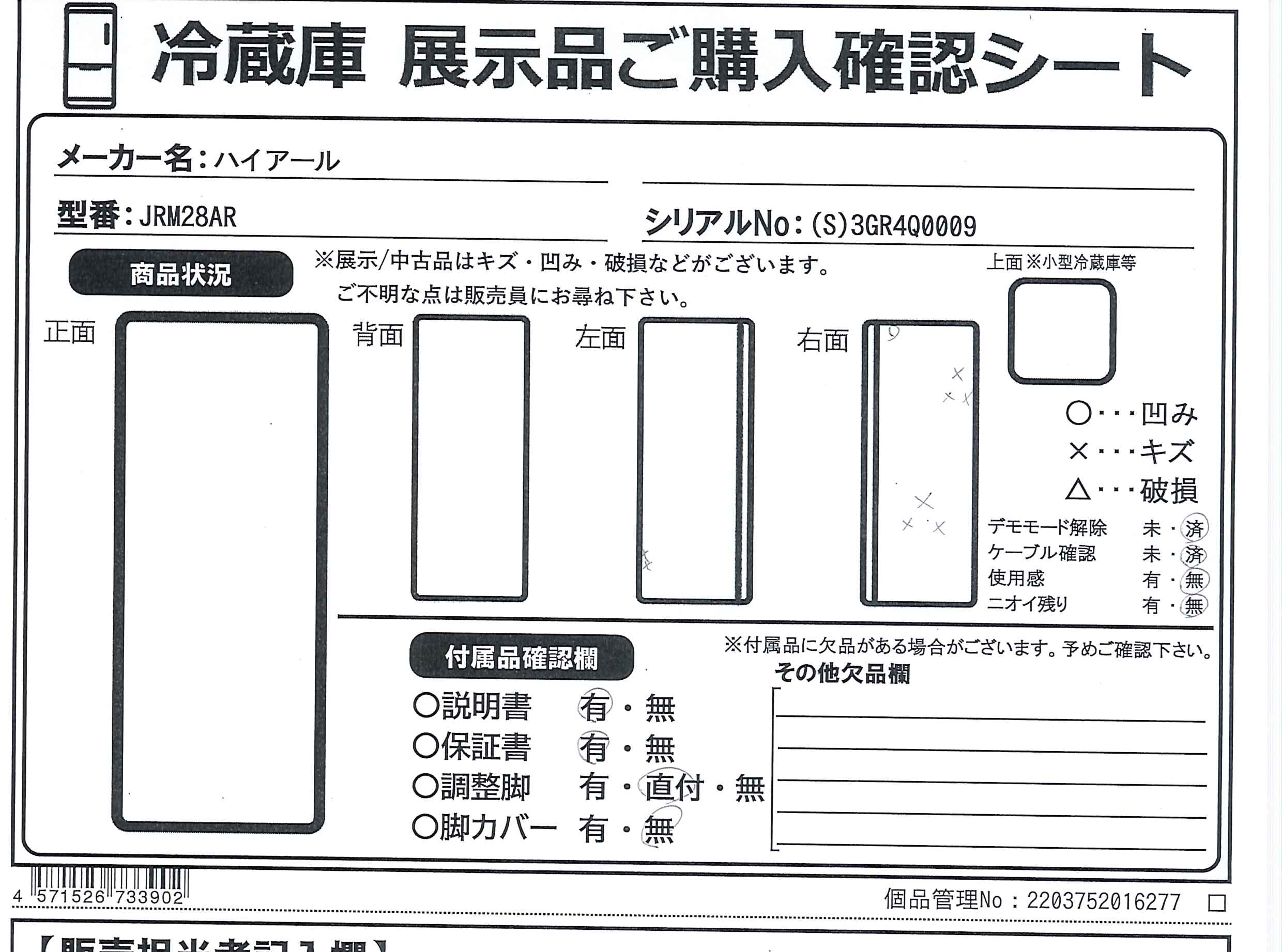 中古商品ランクについて 付属品・商品状態について 〔付属品〕説明書、調節脚、フリーポケットA、フリーポケットB×3、ボトルポケット、冷蔵室棚A×3、冷蔵室棚B、変温ケースカバー、変温ケース、製氷皿セット×2、アイスボックス、冷凍室トレイ、冷凍室バスケットA、冷凍室バスケットB