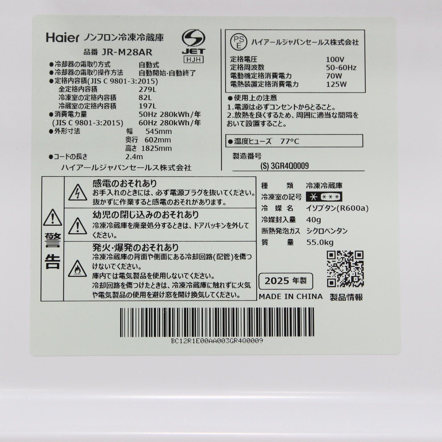 ▼同型番の新品商品はこちら![]() ハイアール 冷蔵庫 ステンレスシルバー JR-M28AR-S [幅54.5cm /279L /2ドア /右開きタイプ /2025年] 【基本設置料金セット】 ¥62,818(税込) 0ポイントサービス 数量限定 |