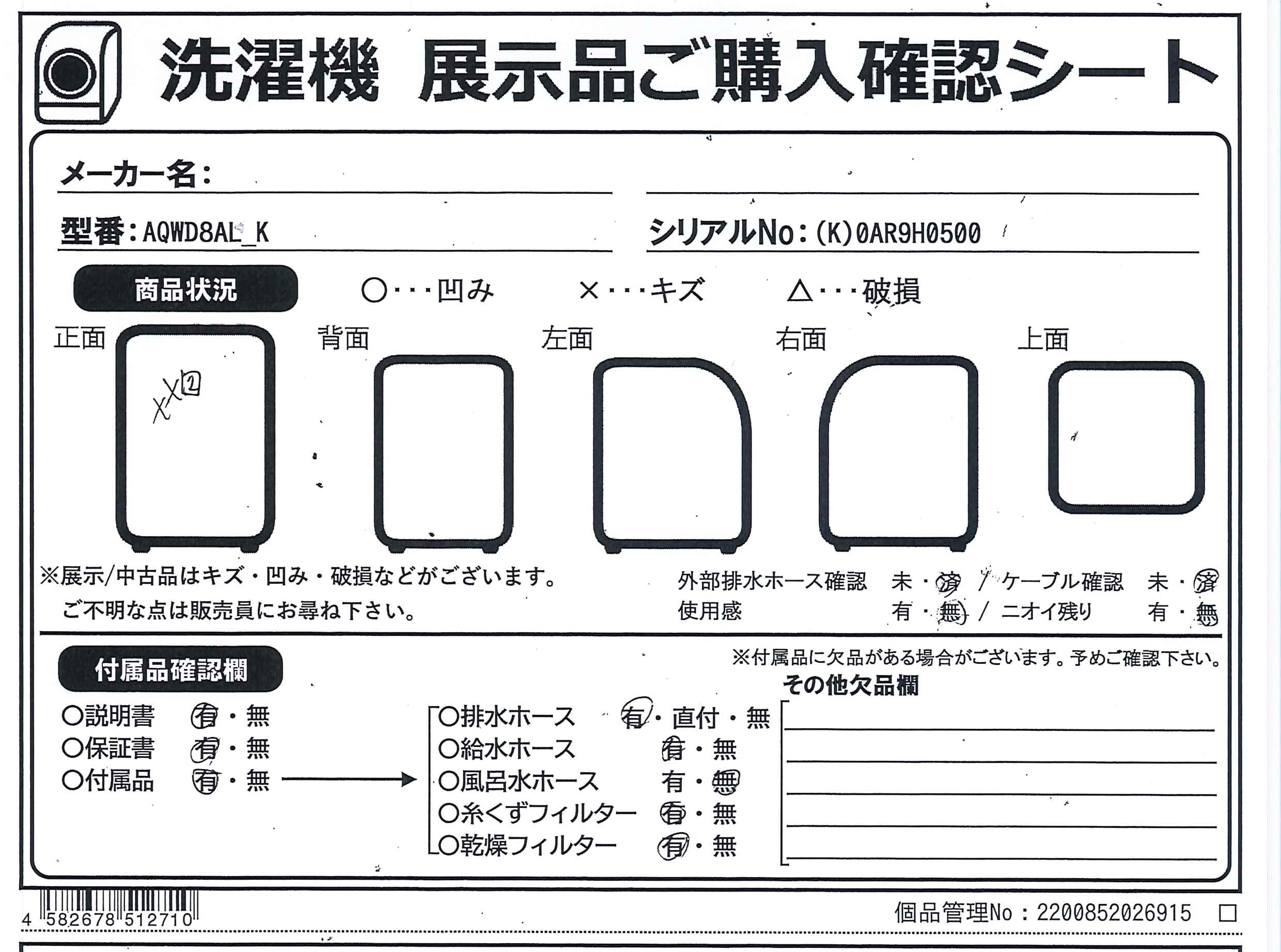 中古商品ランクについて 付属品・商品状態について 〔付属品〕取扱説明書、据付説明書、かんたんガイド、給水ホース(マジックつぎ手付き)(長さ約150cm)、キャップ×4、排水ホース(長さ約100cm)、ストッパー、スパナ
