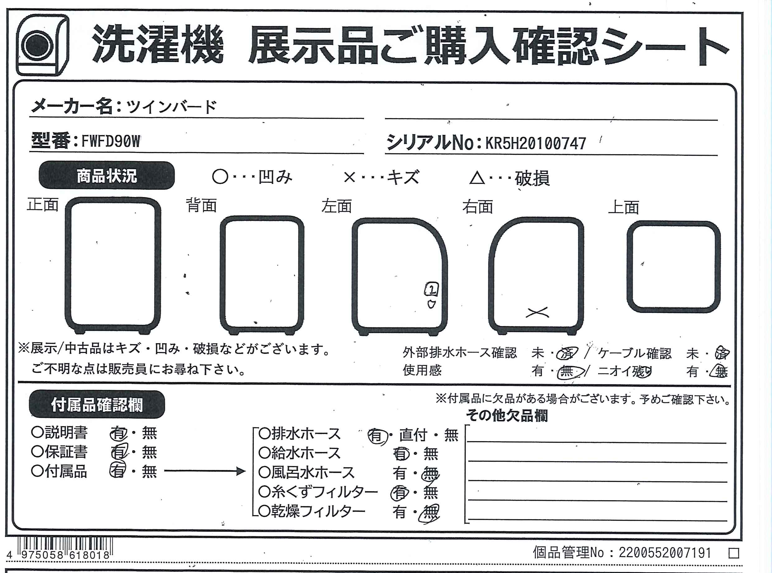 中古商品ランクについて 付属品・商品状態について 〔付属品〕取扱説明書、給水ホース、排水ホース、キャップ・ネジ×4