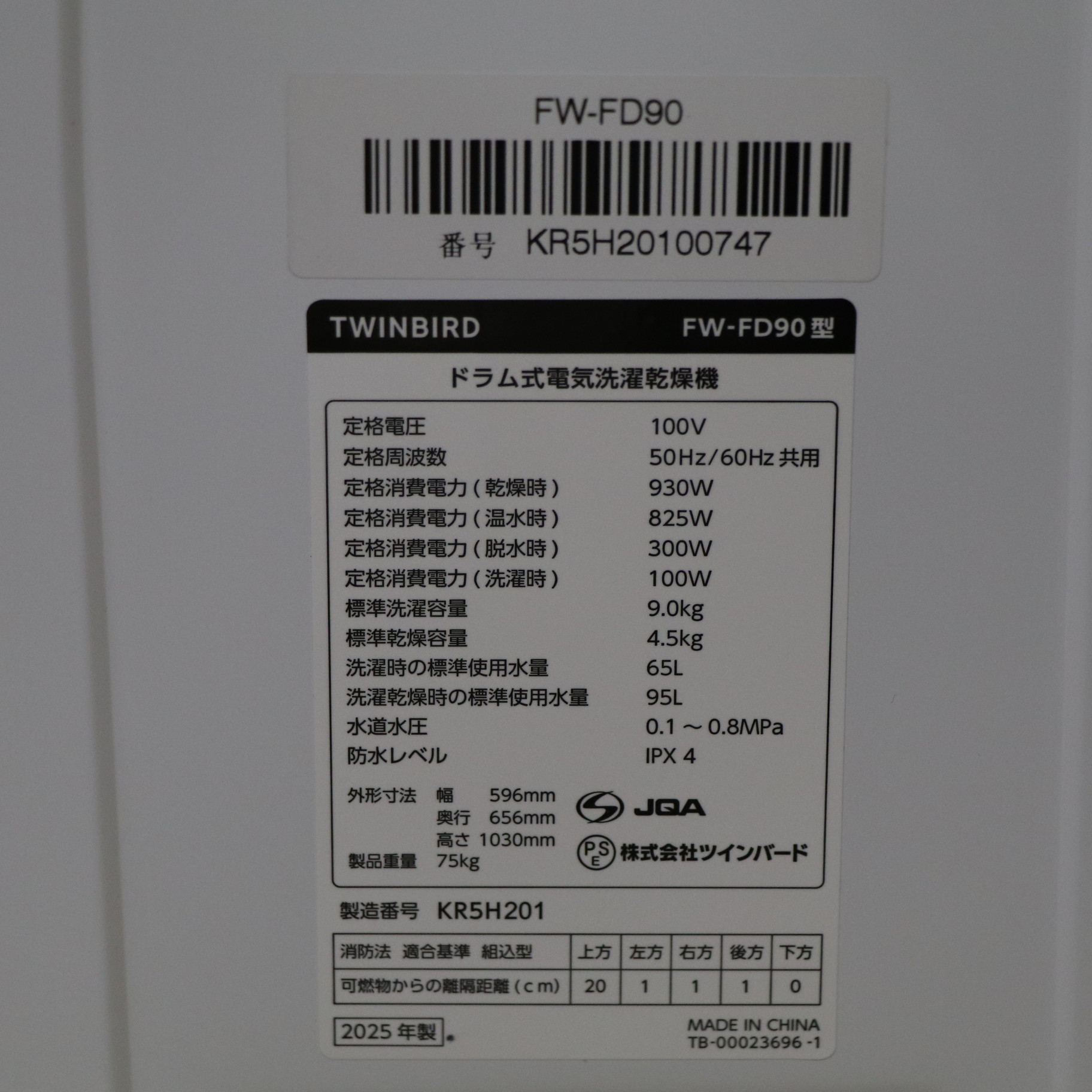 〔展示品〕 ドラム式電気洗濯乾燥機 ツインバード ホワイト FW-FD90W [洗濯9.0kg /乾燥4.5kg /ヒーター乾燥(水冷・除湿タイプ) /左開き]