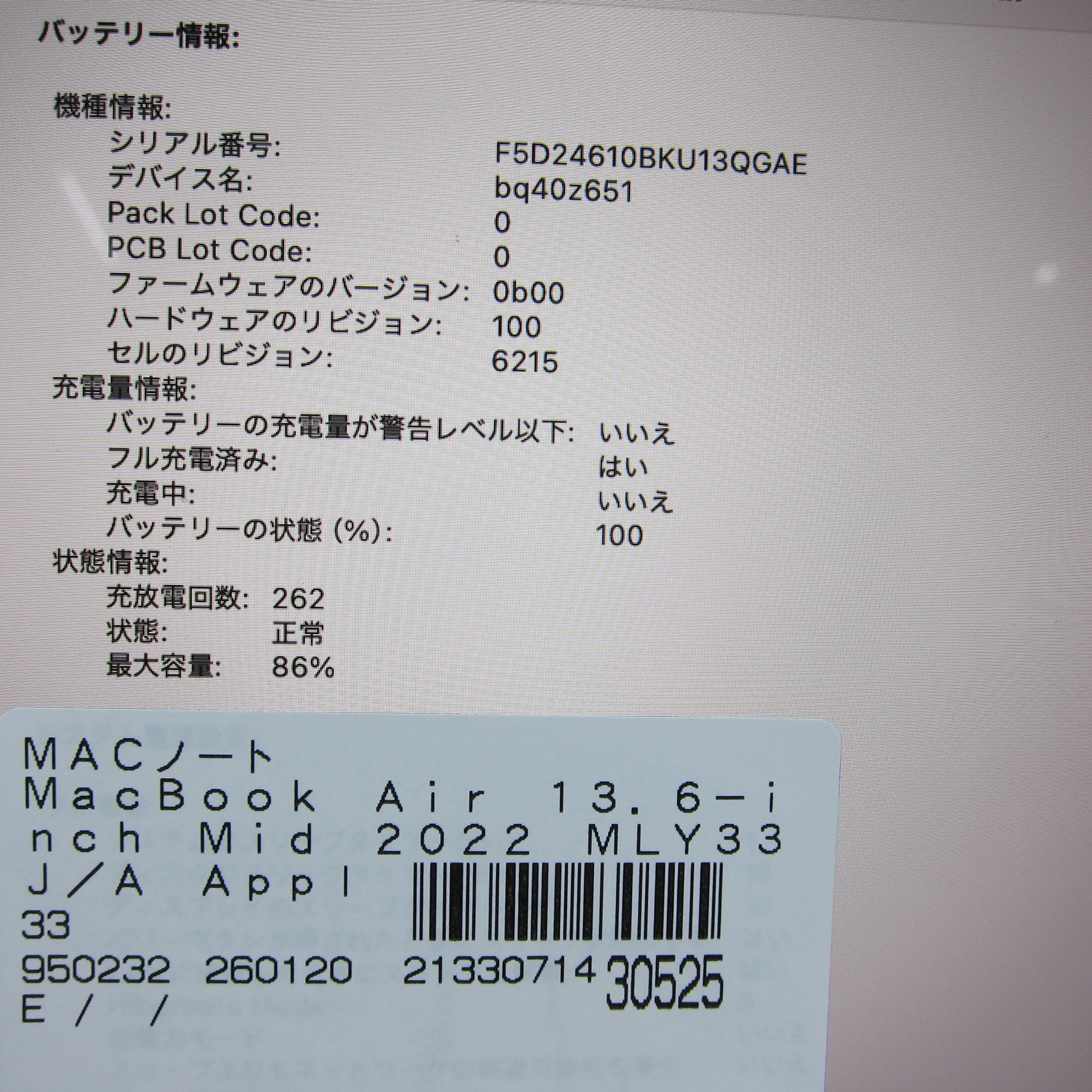 〔中古品〕 MacBook Air 13.6-inch Mid-2022 MLY33J/A Apple M2 8コアCPU_8コアGPU 8GB SSD256GB ミッドナイト 〔15.3 Sequoia〕 [グラフィック:オンボード/JISキーボード]