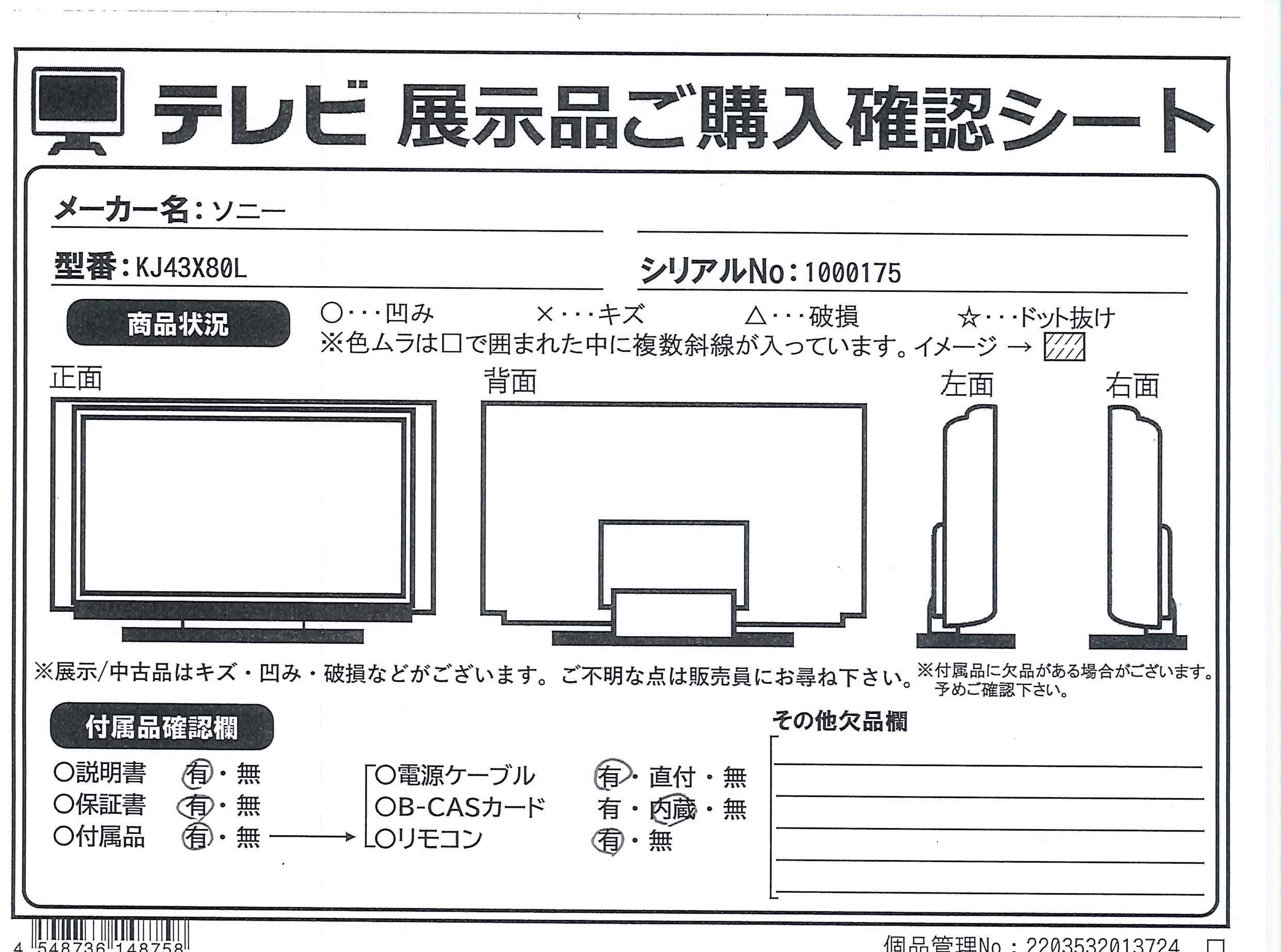 中古商品ランクについて 付属品・商品状態について 〔付属品〕説明書、組み立て/設置ガイド、Google TV セットアップガイド、製品登録のおすすめ、リモコン、リモコン用単四型乾電池×2、スペーサー(VS)×4、ケーブルクリップ(CL)×2、電源ケーブル、スタンド(SB1)、スタンド(SB2)、転倒防止用バンド一式(FB)