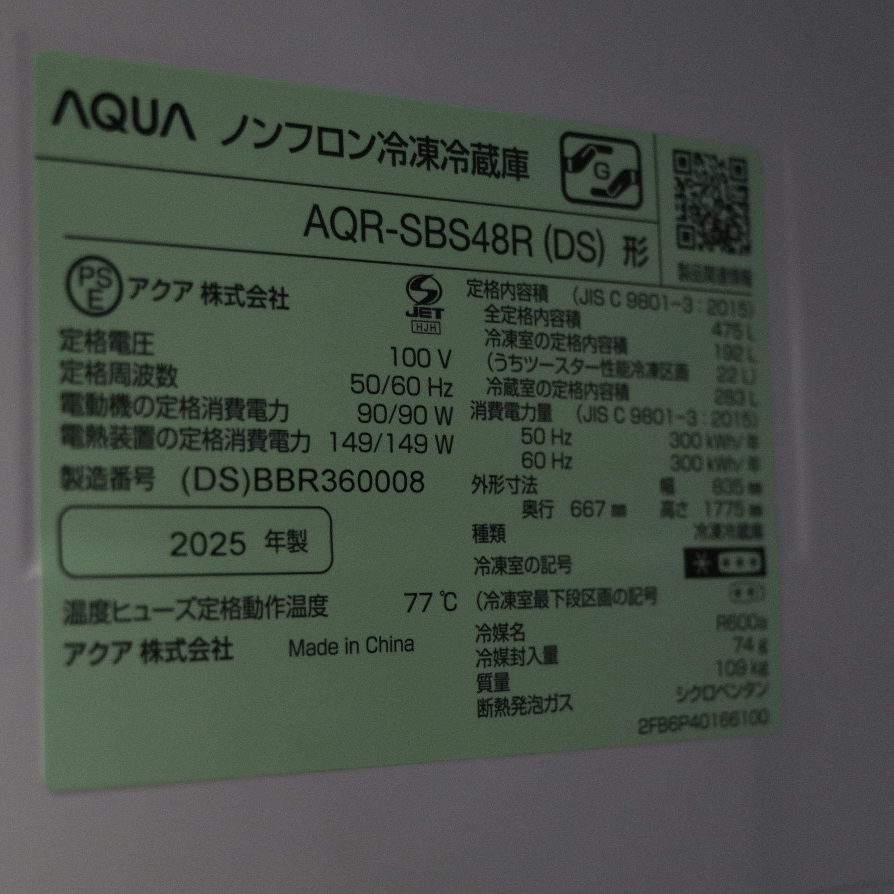 〔展示品〕 冷蔵庫 SIDE BY SIDE(サイド・バイ・サイド) ダークシルバー AQR-SBS48R-DS [幅83.5cm /475L /2ドア /観音開きタイプ /2024年]