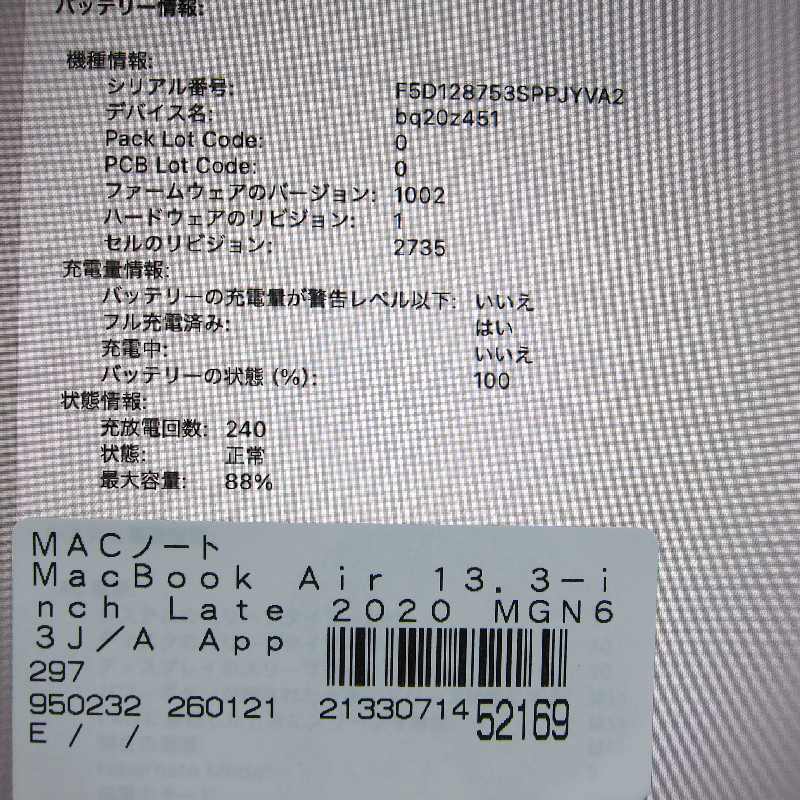 〔中古品(難あり)〕 MacBook Air 13.3-inch Late-2020 MGN63J/A Apple M1 8コアCPU_7コアGPU 8GB SSD256GB スペースグレイ 〔15.3 Sequoia〕 [グラフィック:オンボード/JISキーボード]