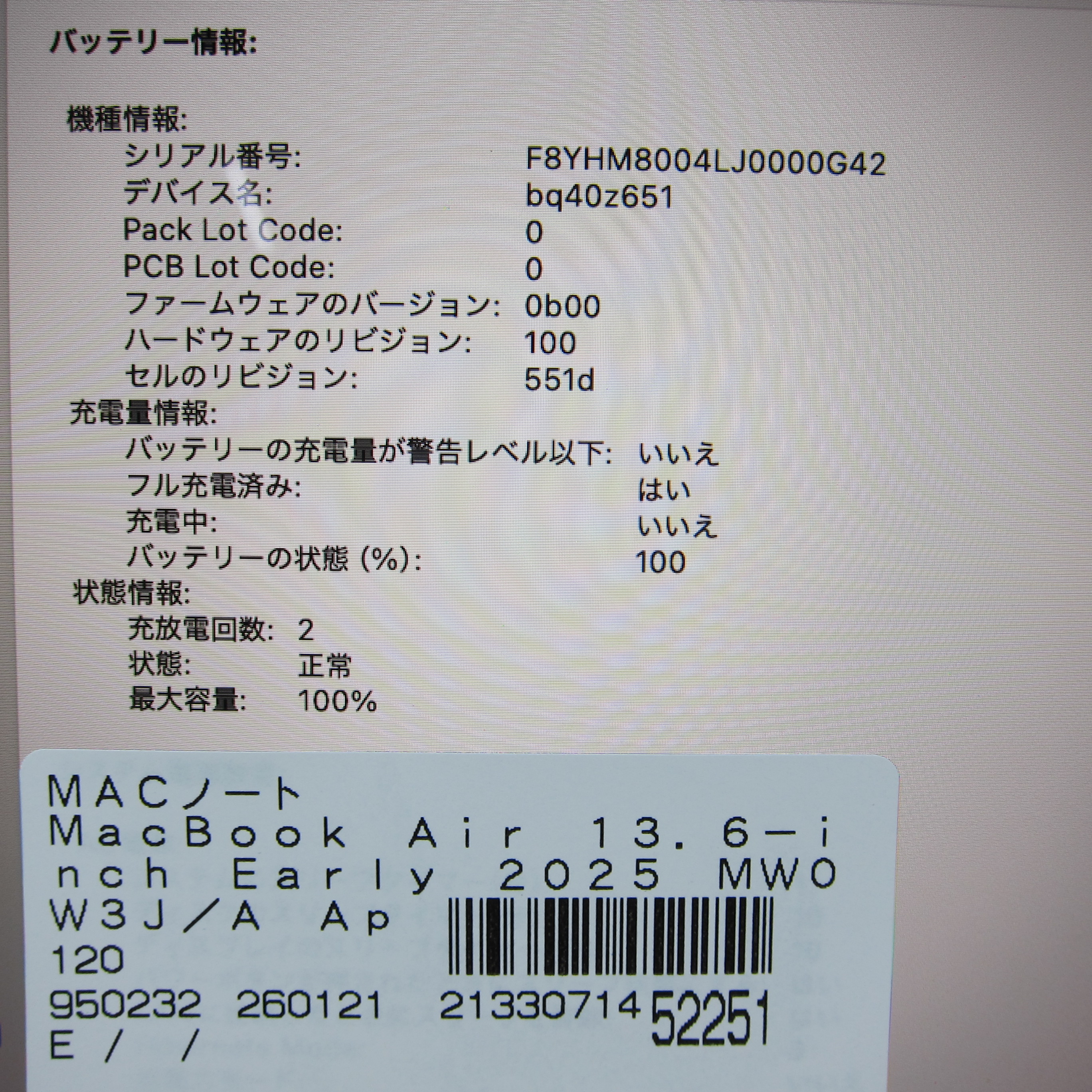 〔中古品〕 MacBook Air 13.6-inch Early-2025 MW0W3J/A Apple M4 10コアCPU_8コアGPU 16GB SSD256GB シルバー 〔15.7 Sequoia〕 [グラフィック:オンボード/JISキーボード]