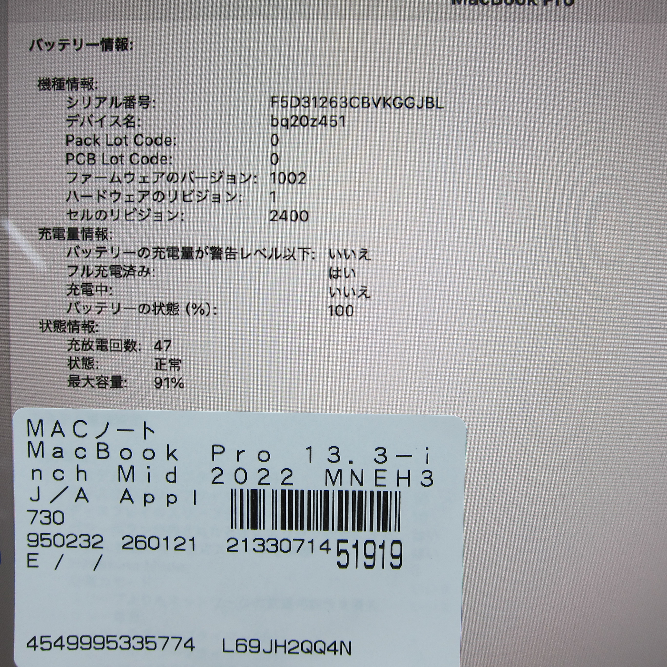 〔中古品〕 MacBook Pro 13.3-inch Mid-2022 MNEH3J/A Apple M2 8コアCPU_10コアGPU 8GB SSD256GB スペースグレイ 〔15.3 Sequoia〕 [グラフィック:オンボード/JISキーボード]