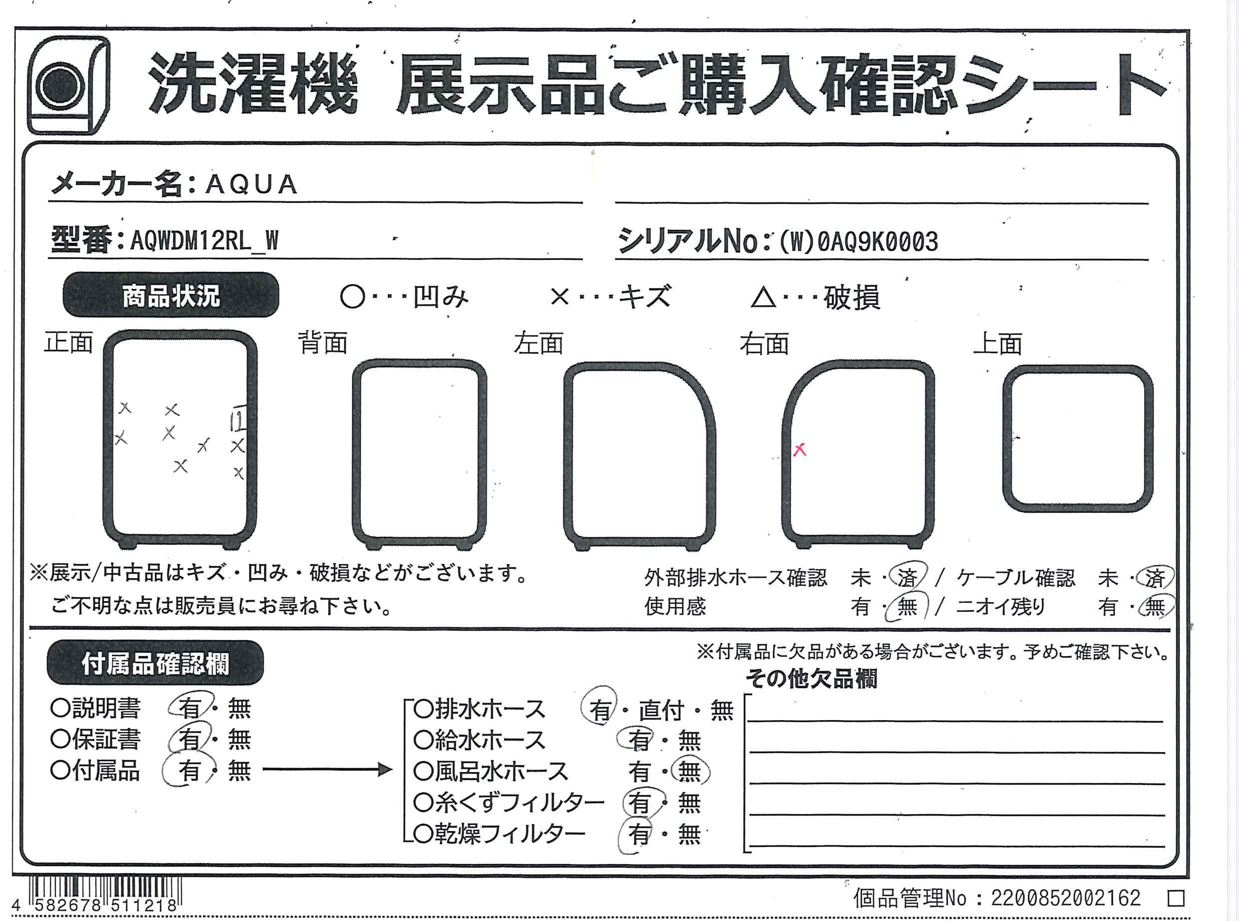 中古商品ランクについて 付属品・商品状態について 〔付属品〕取扱説明書、据付説明書、かんたんガイド、給水ホース、マジックつぎ手、キャップ×4、排水ホース、排水ジョイントホース、スリーブ、ホースバンド、ストッパー、スパナ