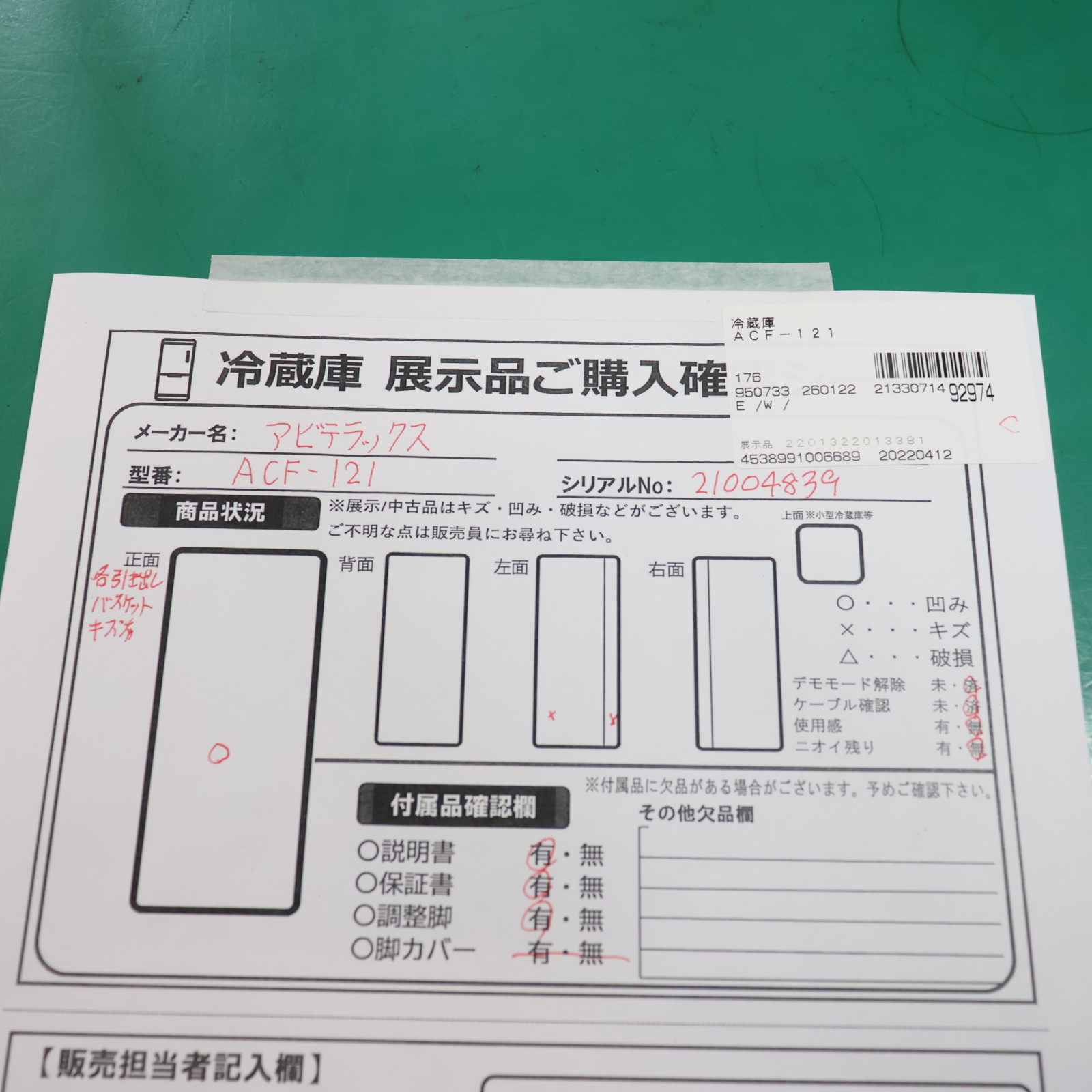 中古商品ランクについて 付属品・商品状態について 〔付属品〕取扱説明書、霜取り用ヘラ、引き出し式バスケット×4、調整脚×2
