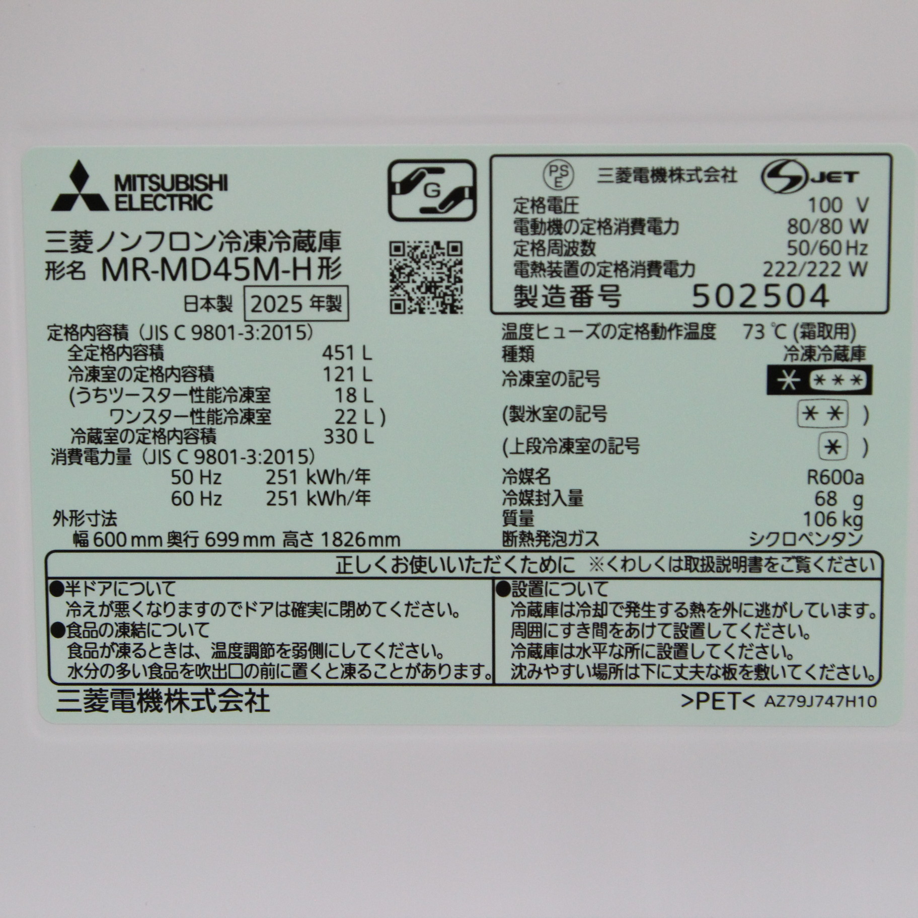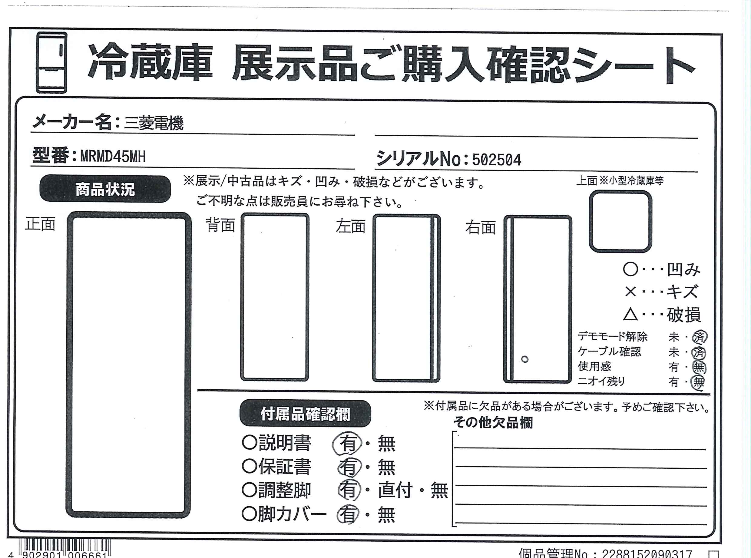 中古商品ランクについて 付属品・商品状態について 〔付属品〕説明書、「三菱冷蔵庫アプリ」初期設定用説明書、ガラスシェルフX2、ワン・ツー棚、ワイドチルドケースフタ、ワイドチルドケース、氷点下ストッカーケース、給水タンク、チェンジポケット(大・中)各1、チェンジポケット(小)X2、タマゴトレイ、ボトルポケット、製氷皿、貯氷箱、防音マット、アイスサーバー、瞬冷凍室ケース、アルミトレイ、野菜ケース、段違いケース、フリージングケース(上・下)各1、脚カバー、調整脚X2