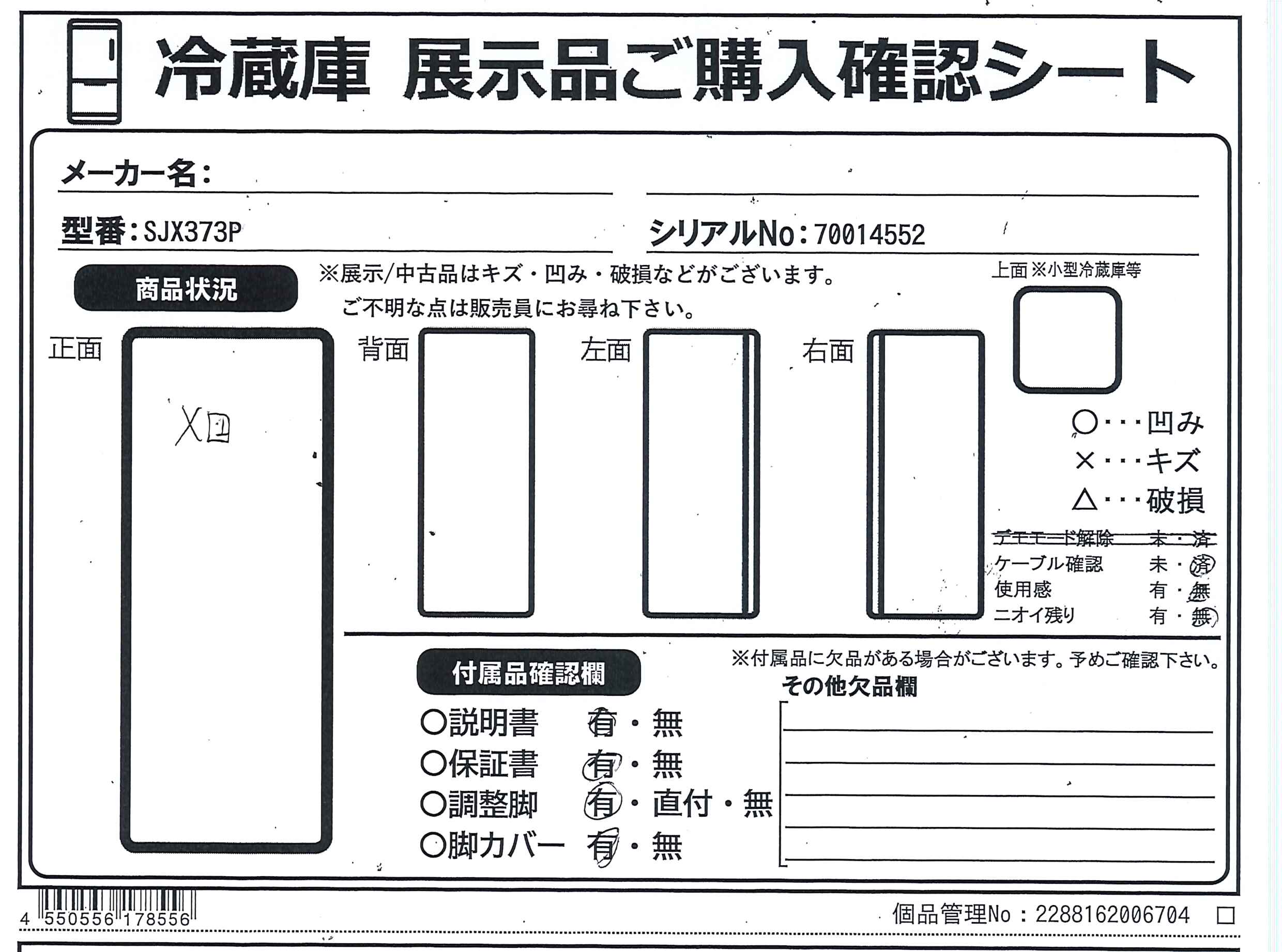 〔展示品〕 冷蔵庫 マットシャンパン SJ-X373P-N [60cm /374L /3ドア /左右開きタイプ]