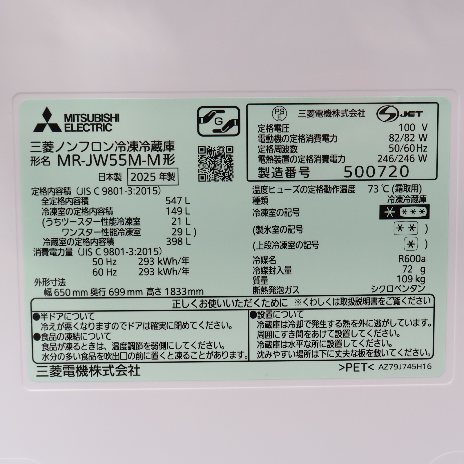 〔展示品〕 冷蔵庫 JWシリーズ ロイヤルウッド MR-JW55M-M [幅65cm /547L /6ドア /観音開きタイプ /2025年]