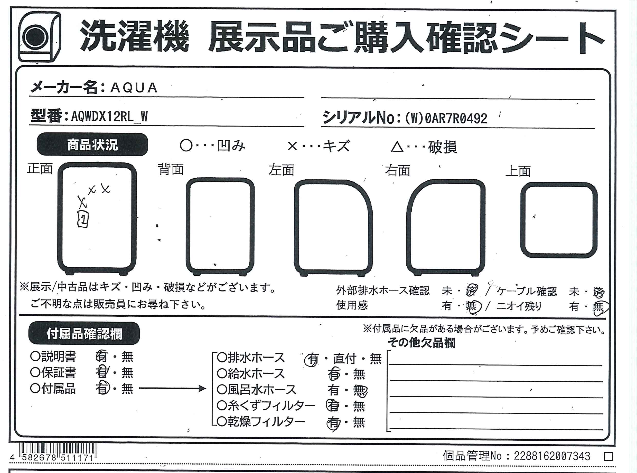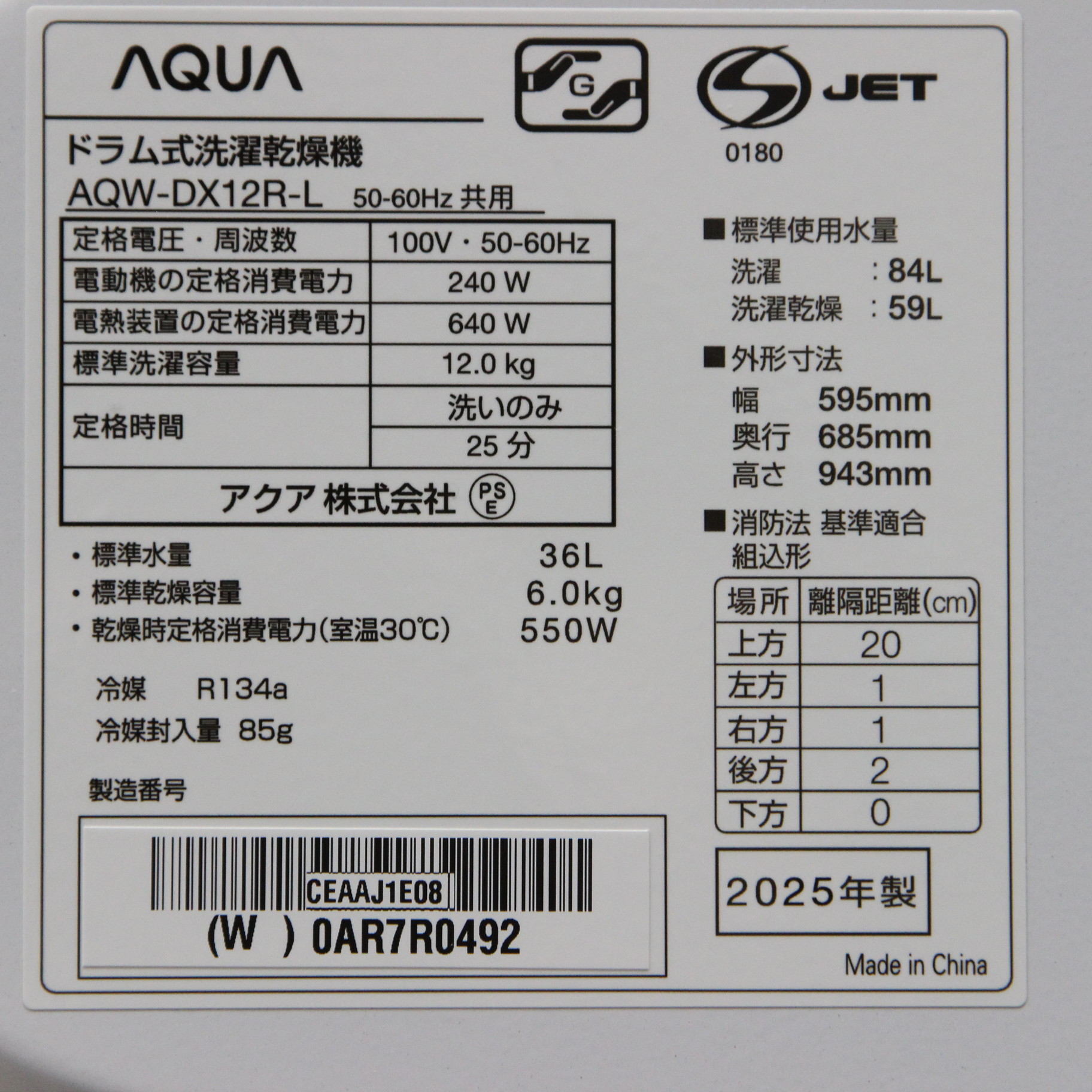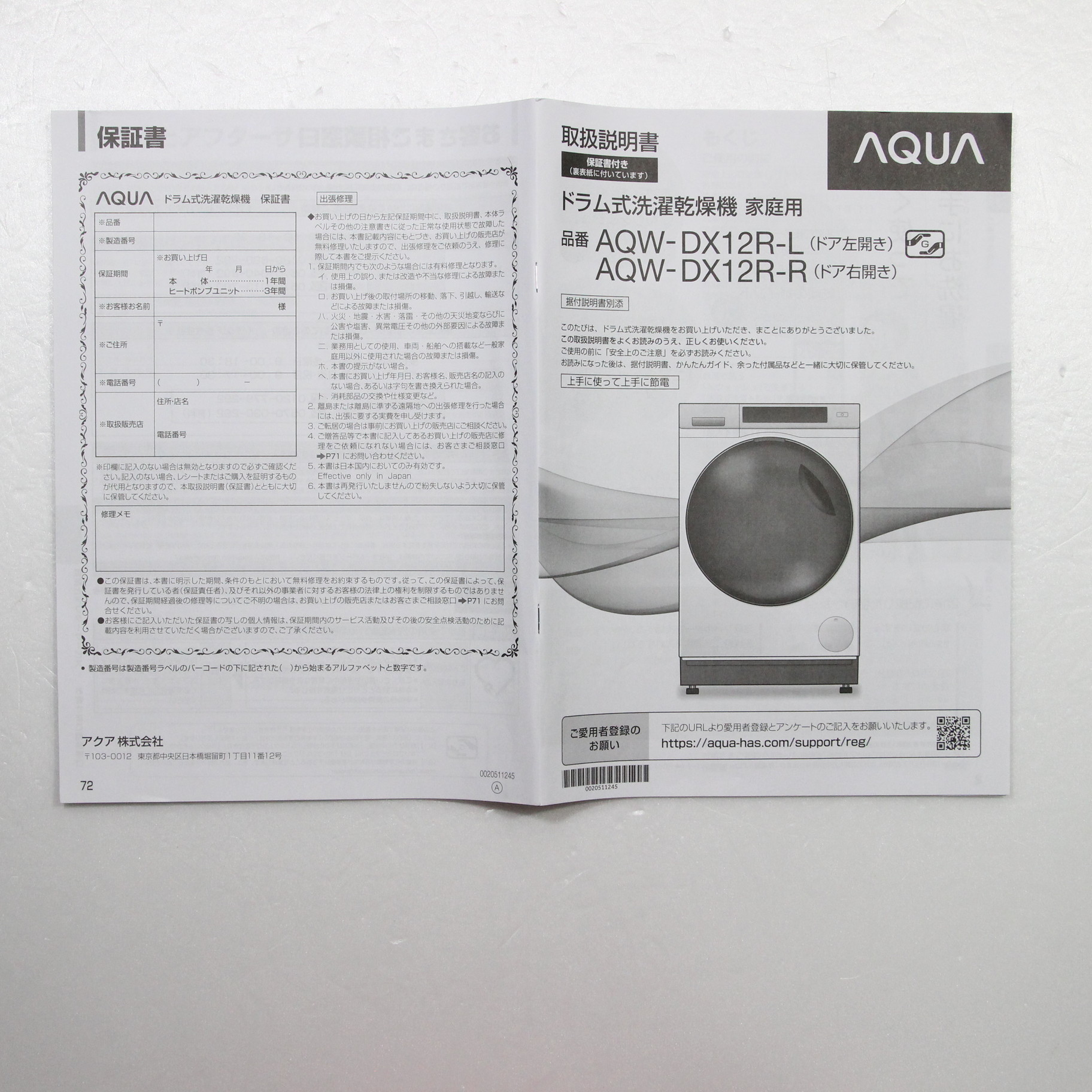 〔展示品〕 ドラム式洗濯乾燥機 AQUA ホワイト AQW-DX12R-L(W) [洗濯12.0kg /乾燥6.0kg /ヒートポンプ乾燥 /左開き]