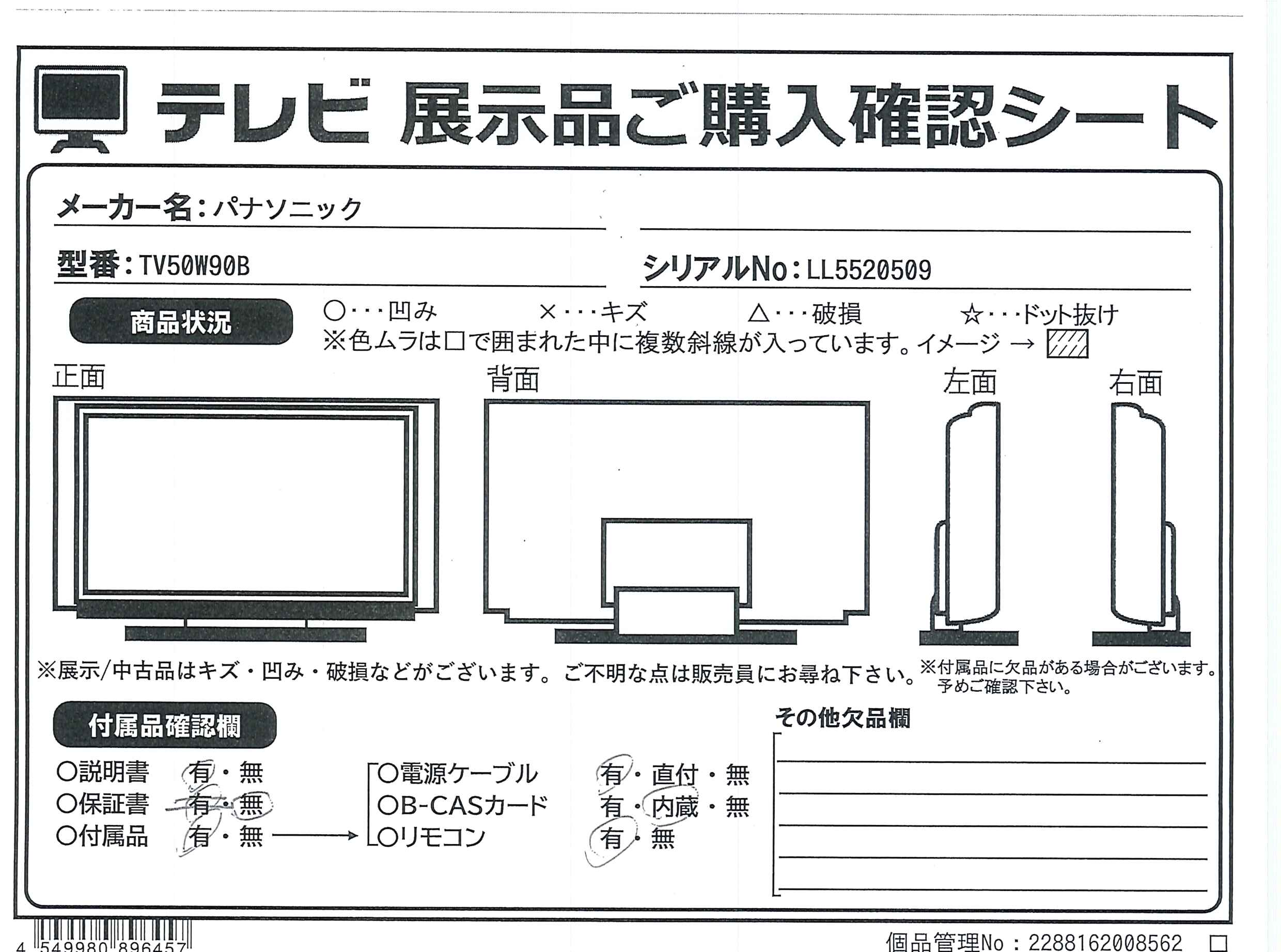 中古商品ランクについて 付属品・商品状態について 〔付属品〕説明書、リモコン、リモコン用乾電池×2、電源コード、転倒防止スタンド、本体固定用ネジ×4、クランパー、転倒落下防止部品一式