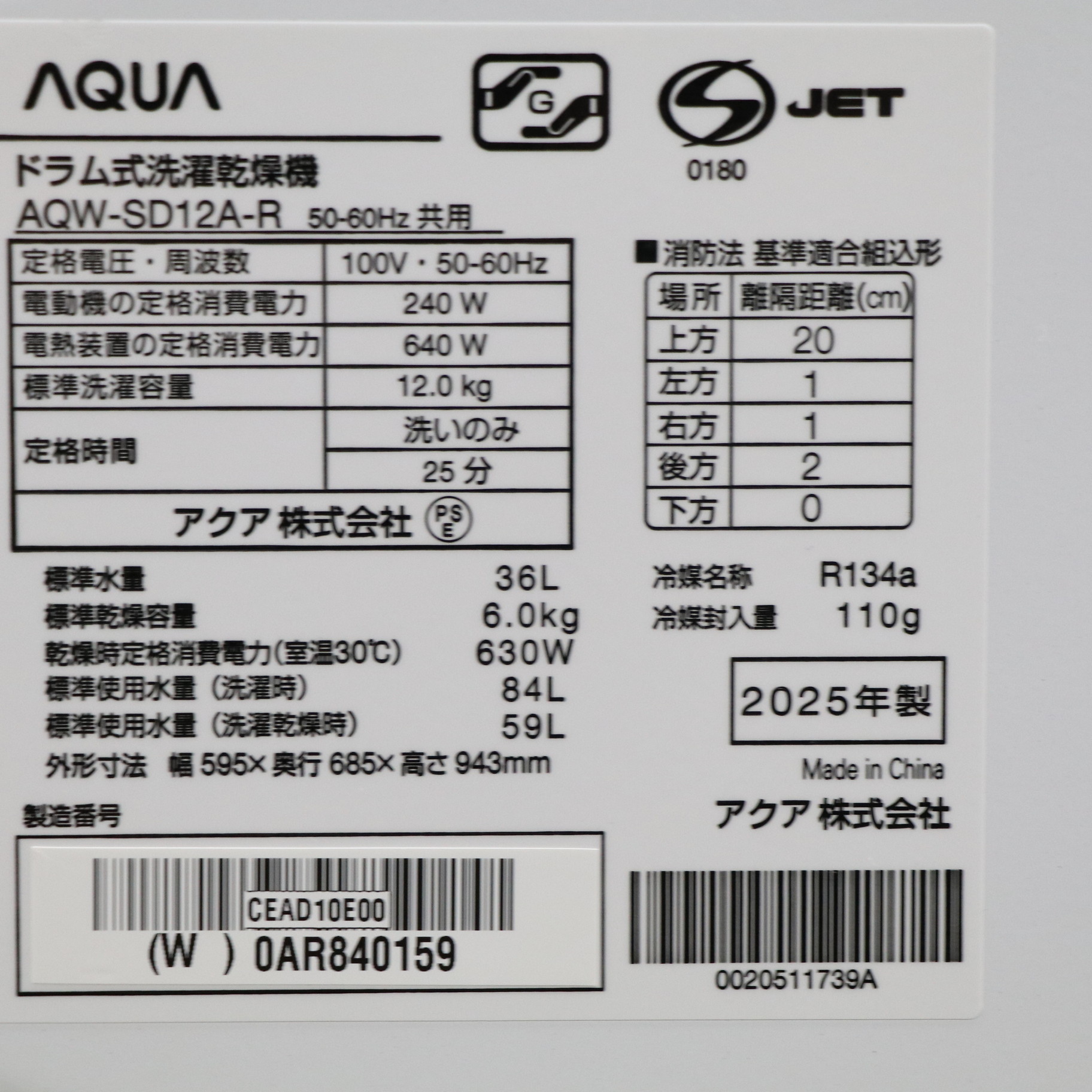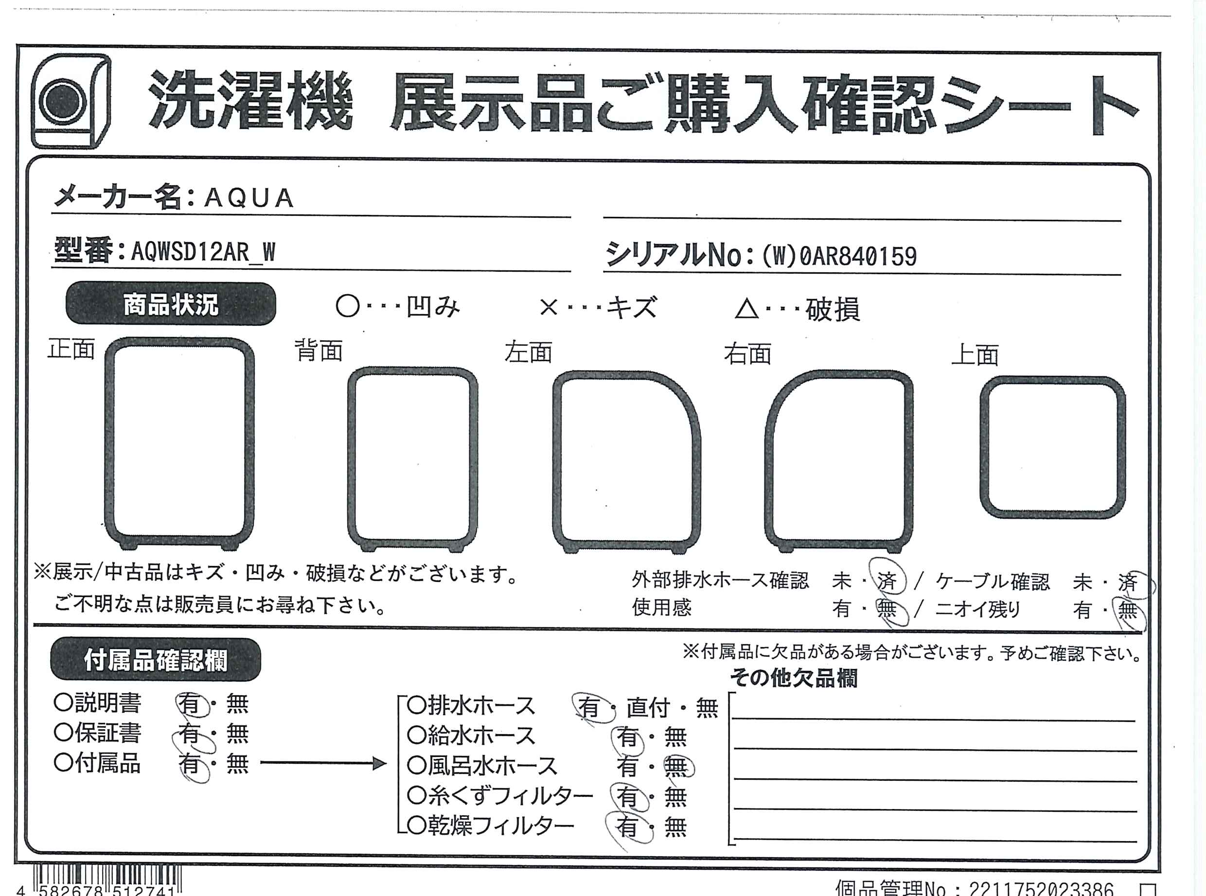 〔展示品〕 ドラム式洗濯乾燥機 AQUA ホワイト AQW-SD12A-R(W) [洗濯12.0kg /乾燥6.0kg /ヒートポンプ乾燥 /右開き]