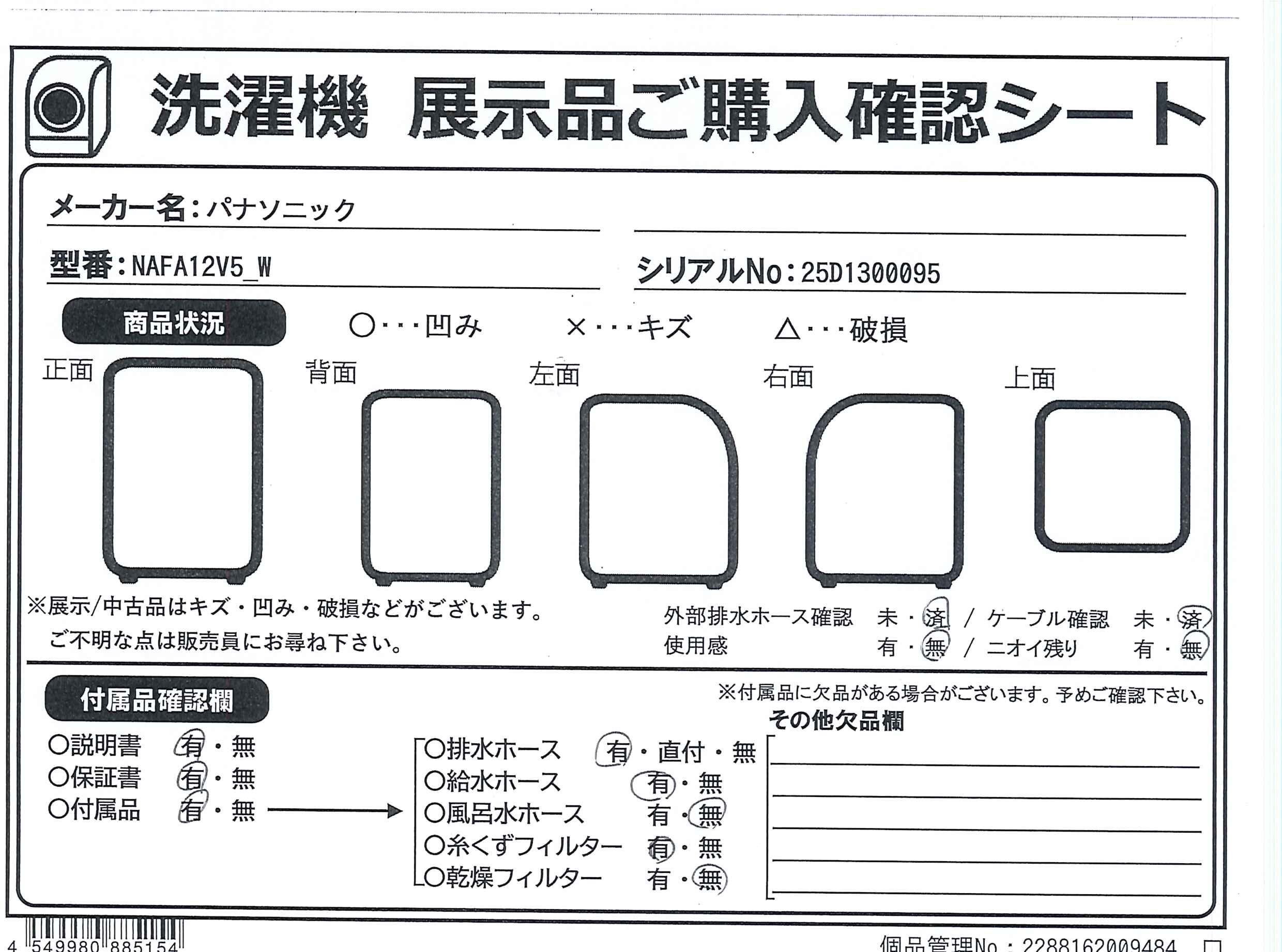 中古商品ランクについて 付属品・商品状態について 〔付属品〕説明書、「次亜除菌」コース専用錠剤、外部排水ホース、給水ホース、保護カバー、保護カバー取付用ネジ×2、調整脚×2、糸くずフィルターX2、据付説明書