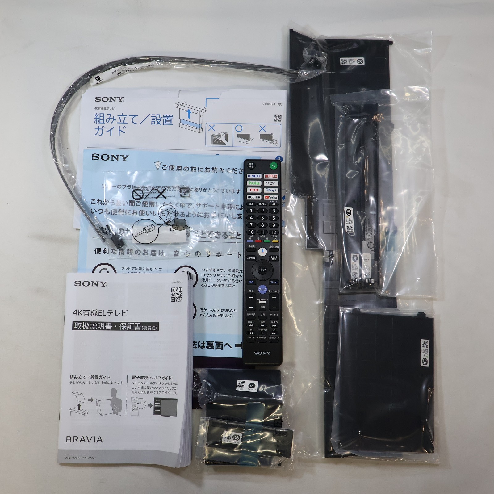 〔付属品〕取扱説明書、組み立て/設置ガイド、製品登録のおすすめ、リモコン、スタンド一式(SB1・SB2)、背面カバー(CN1)、背面カバー(CN2)、背面カバー(CA)、背面カバー(KB)、カメラ(KA)、スタンド固定用ねじ×4(M5L12)、転倒防止部品一式、光デジタル端子/変換プラグ、背面カバー(CC)
