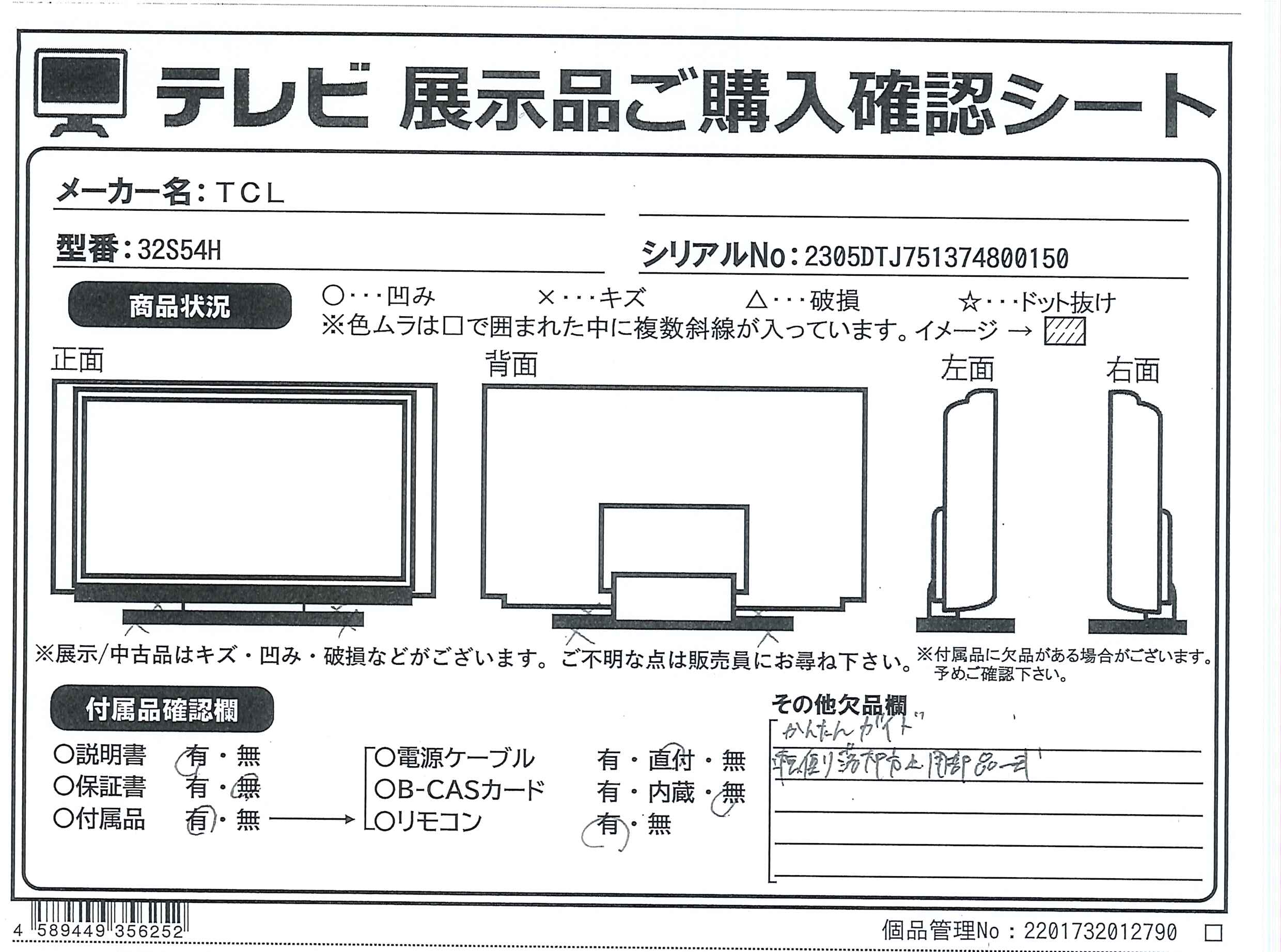 中古商品ランクについて 付属品・商品状態について 〔付属品〕取扱説明書、標準リモコン、単四型乾電池、スタンド×2、スタンド用ネジ×4