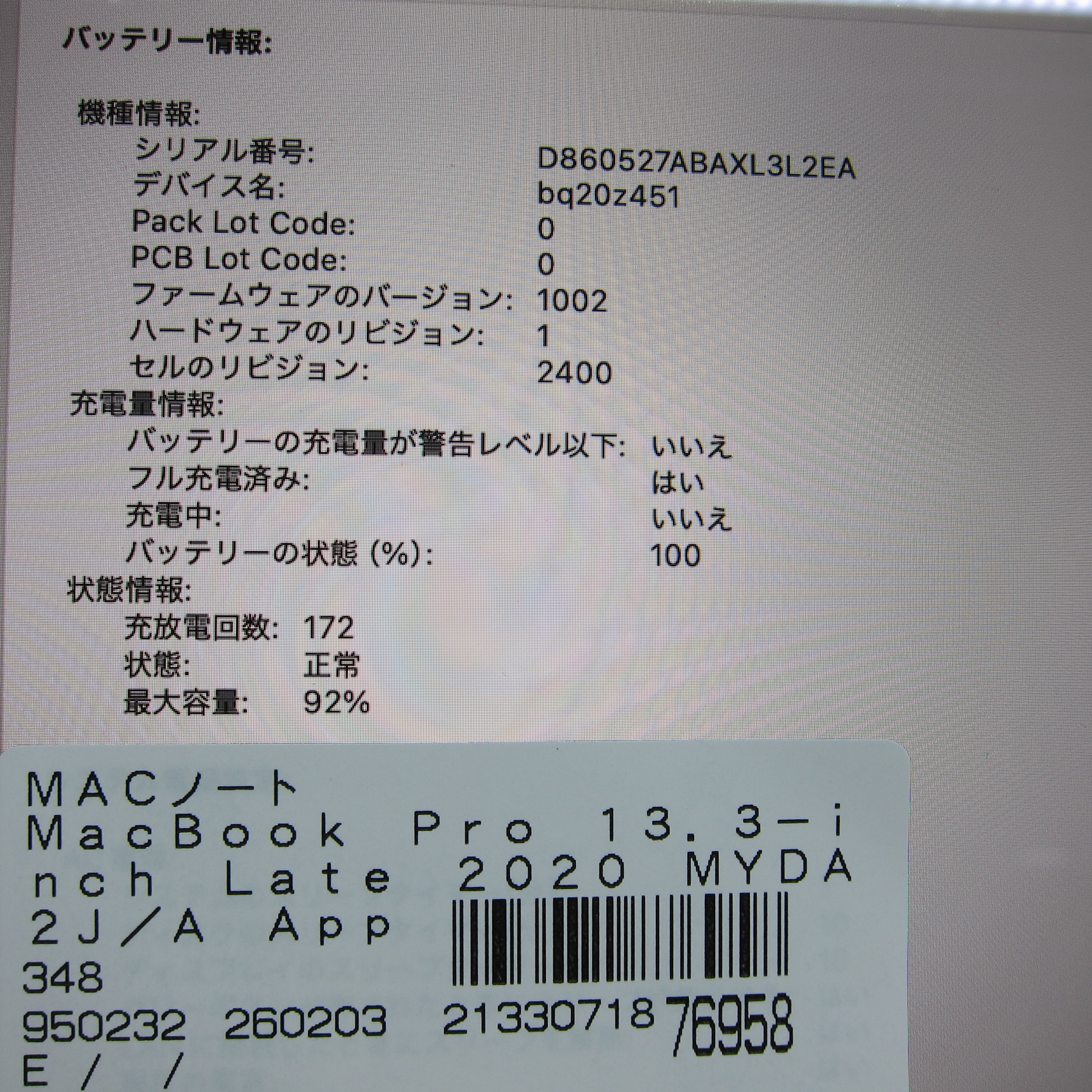 商品名 〔中古品〕 MacBook Pro 13.3-inch Late-2020 MYDA2J/A Apple M1 8コアCPU_8コアGPU 8GB SSD256GB シルバー 〔15.3 Sequoia〕 [グラフィック:オンボード/JISキーボード]