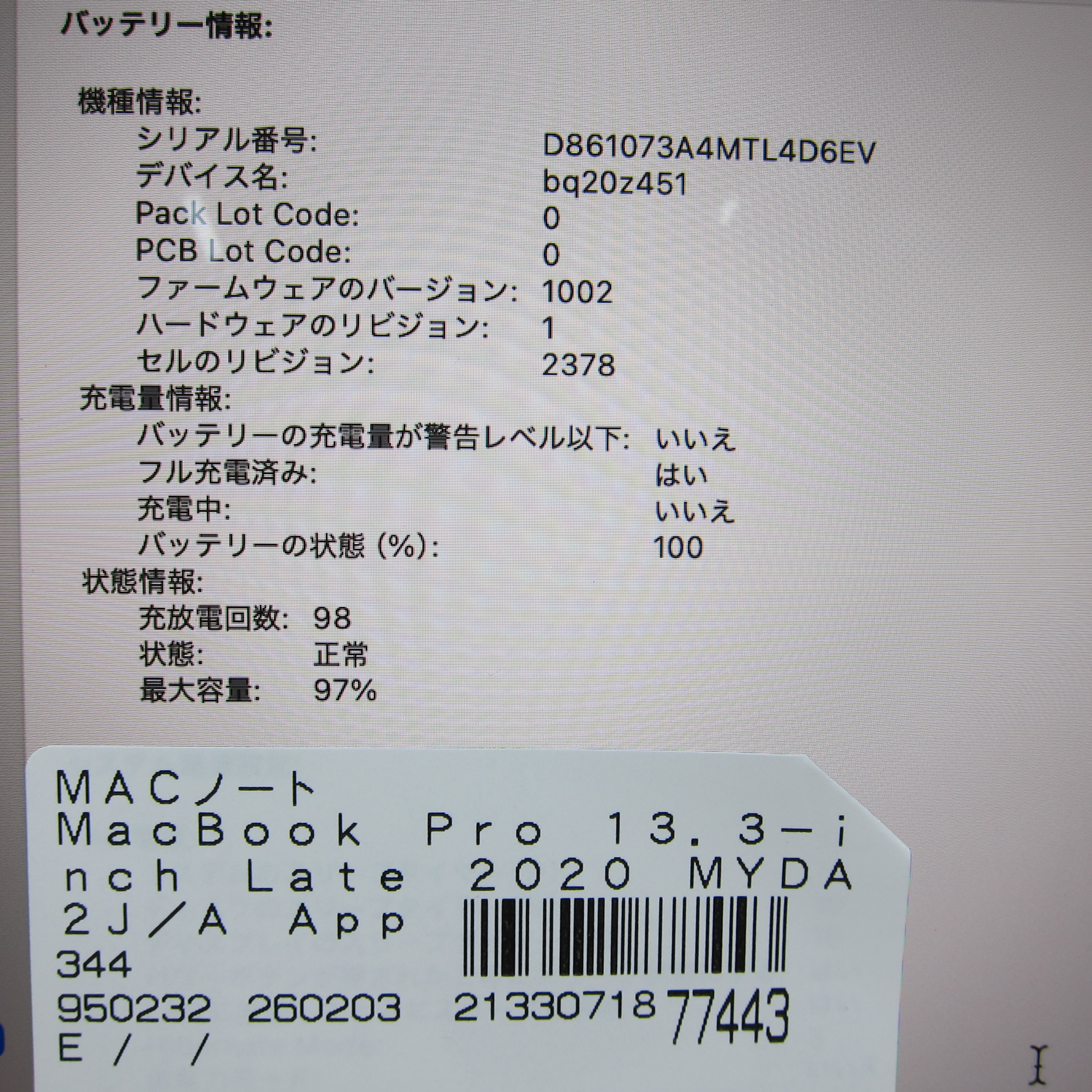 商品名 〔中古品〕 MacBook Pro 13.3-inch Late-2020 MYDA2J/A Apple M1 8コアCPU_8コアGPU 8GB SSD256GB シルバー 〔15.3 Sequoia〕 [グラフィック:オンボード/JISキーボード]