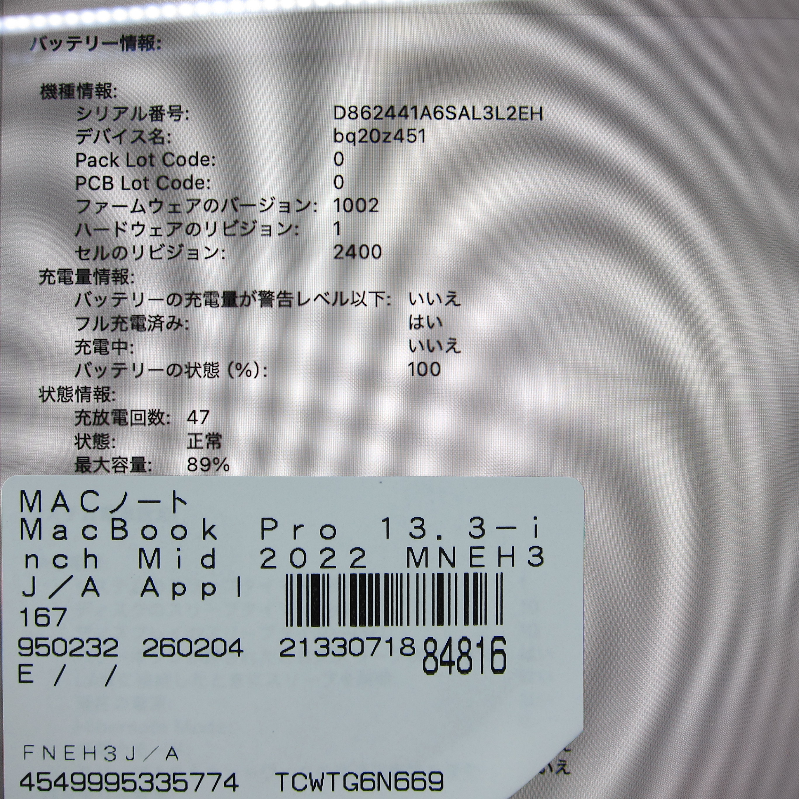 商品名 〔中古品〕 MacBook Pro 13.3-inch Mid-2022 MNEH3J/A Apple M2 8コアCPU_10コアGPU 8GB SSD256GB スペースグレイ 〔15.3 Sequoia〕 [グラフィック:オンボード/JISキーボード]