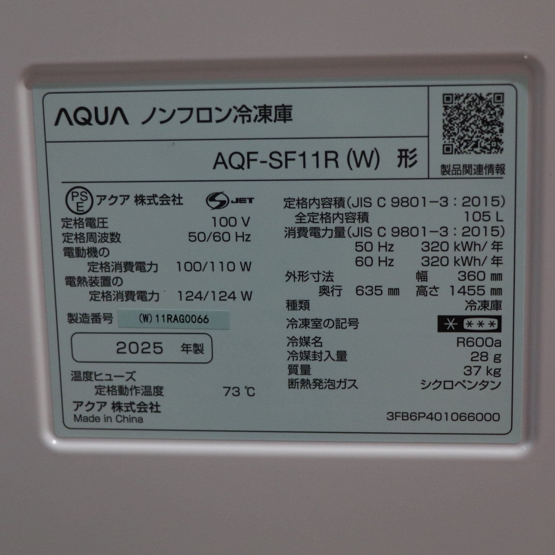 〔展示品〕 ファン式冷凍庫 ホワイト AQF-SF11R-W [幅36cm /105L /1ドア /右開きタイプ /2025年]