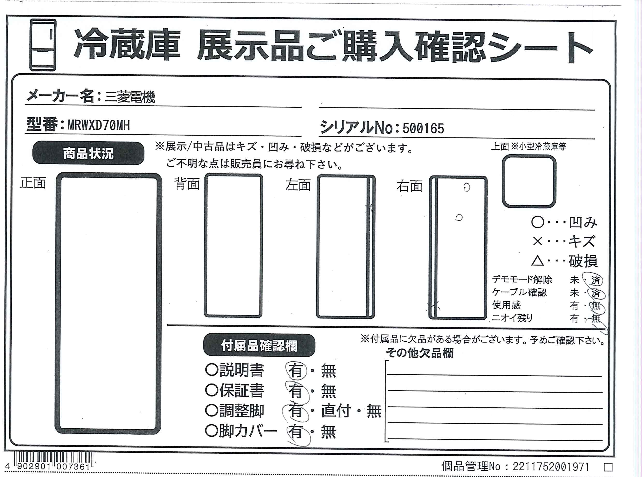 中古商品ランクについて 付属品・商品状態について 〔付属品〕取扱説明書、ガラスシェルフ(上)、ガラスシェルフ(中)、ガラスシェルフ(下)、仕切り、スライドシェルフ(前)、スライドシェルフ(奥)、ワイドチルドケースフタ、ワイドチルドケース、氷点下ストッカーケース、給水タンク(カルキクリーンフィルターつき)、チェンジポケット(大)×2、チェンジポケット(小)×2、フリータマゴケース、タマゴトレイ、ボトルポケット(大)、ボトルポケット(小)、フリーケース(小)、ストッパー、製氷皿、貯氷箱、防音マット、アイスサーバー、瞬冷凍室ケース、アルミトレイ、フリージングケース(上)、フリージングケース(下)、野菜ケース、スライドケース、野菜ケース仕切り、調節脚、脚カバー、調整脚用工具セット