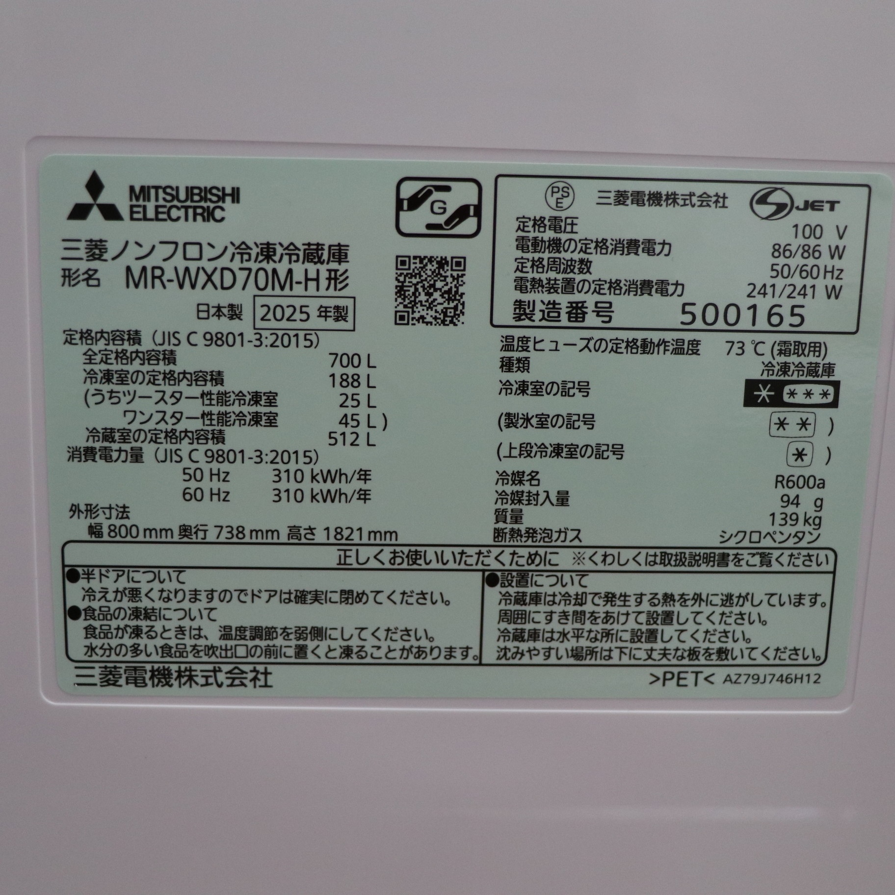 〔展示品〕 冷蔵庫 置けるスマート大容量 WXDシリーズ(プレミアムフレンチモデル) グランドアンバーグレー MR-WXD70M-H [幅80cm /700L /6ドア /観音開きタイプ /2025年]