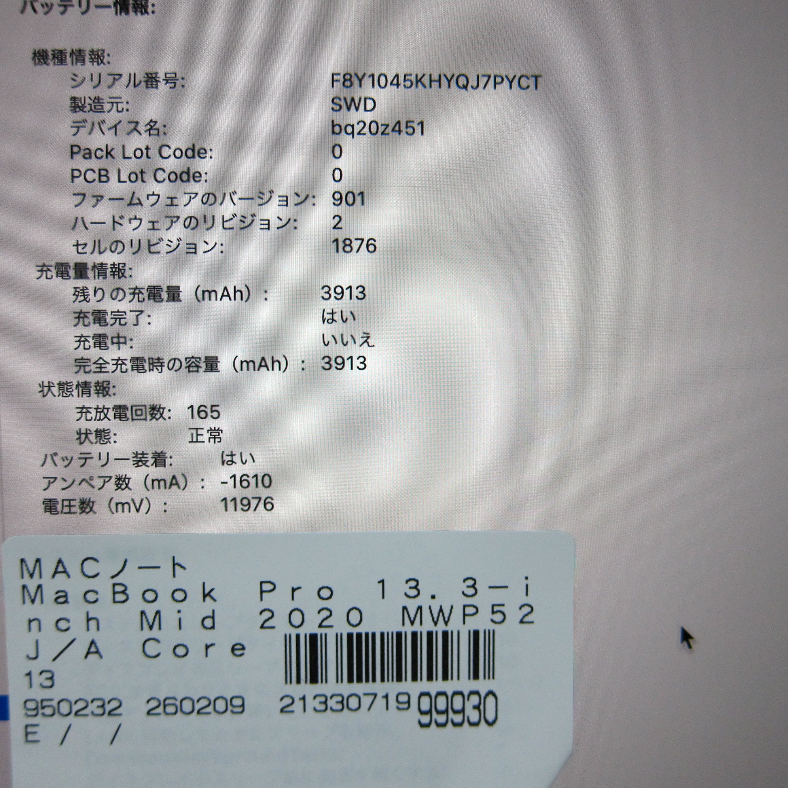 〔中古品〕 MacBook Pro 13.3-inch Mid-2020 MWP52J/A Core_i5 2.0GHz 16GB SSD1TB スペースグレイ 〔10.15 Catalina〕 [グラフィック:Intel Iris Plus Graphics/JISキーボード]