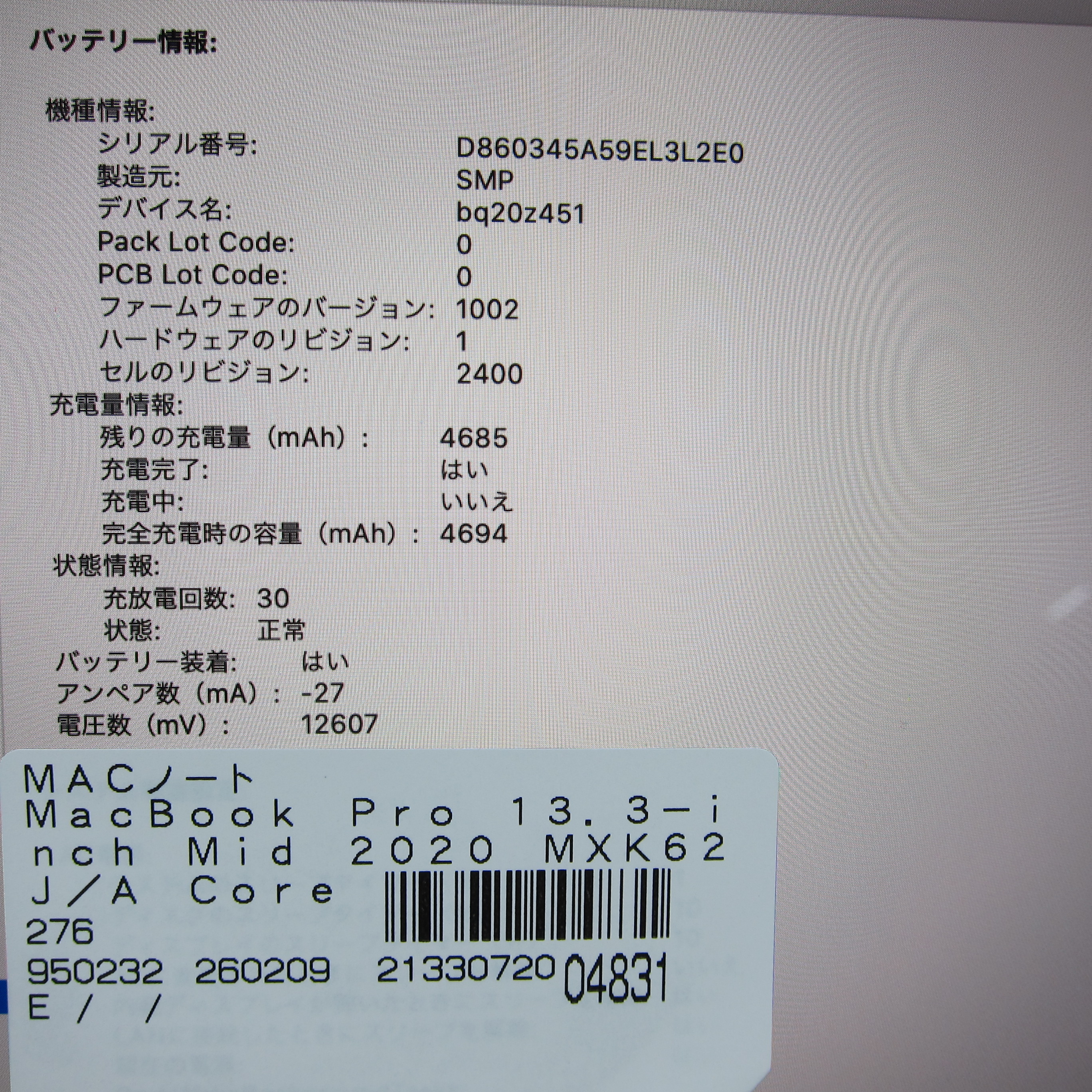 〔中古品〕 MacBook Pro 13.3-inch Mid-2020 MXK62J/A Core_i5 1.4GHz 8GB SSD256GB シルバー 〔10.15 Catalina〕 [グラフィック:Intel Iris Plus Graphics 645(CPU内蔵)/JISキーボード]