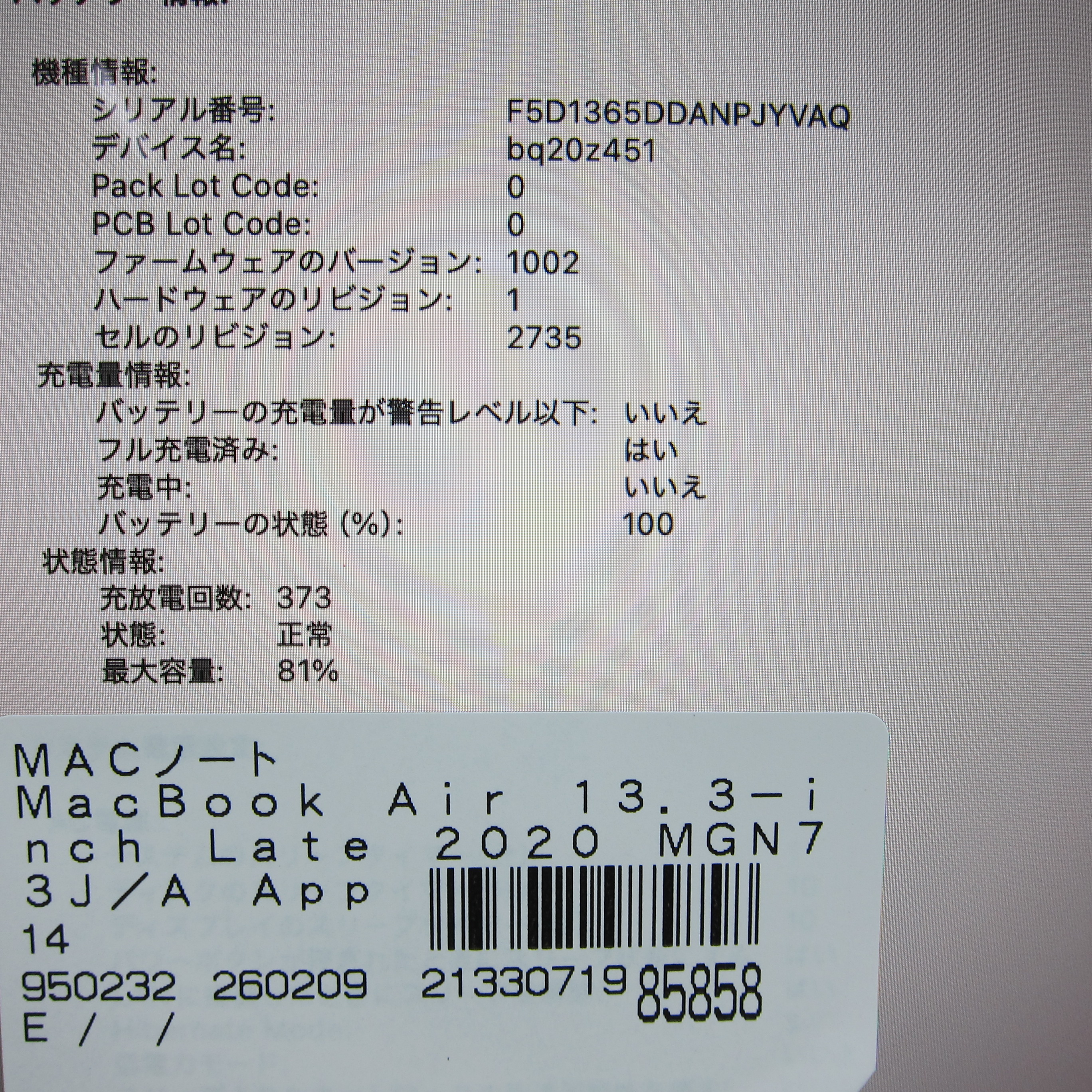 〔中古品〕 MacBook Air 13.3-inch Late-2020 MGN73J/A Apple M1 8コアCPU_8コアGPU 16GB SSD1TB スペースグレイ 〔15.7 Sequoia〕 [グラフィック:オンボード/JISキーボード]