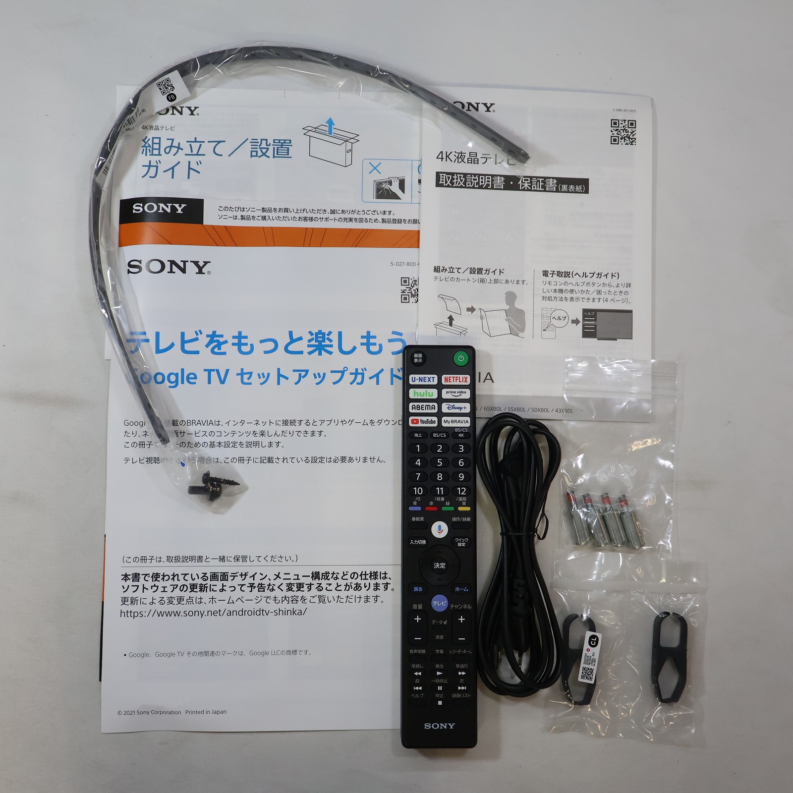 中古商品ランクについて 付属品・商品状態について 〔付属品〕説明書、組み立て/設置ガイド、Google TV セットアップガイド、製品登録のおすすめ、リモコン、スペーサー(VS)×4、ケーブルカバー(CL)×2、電源ケーブル、スタンド(SB1)、スタンド(SB2)、転倒防止用バンド一式(FB)