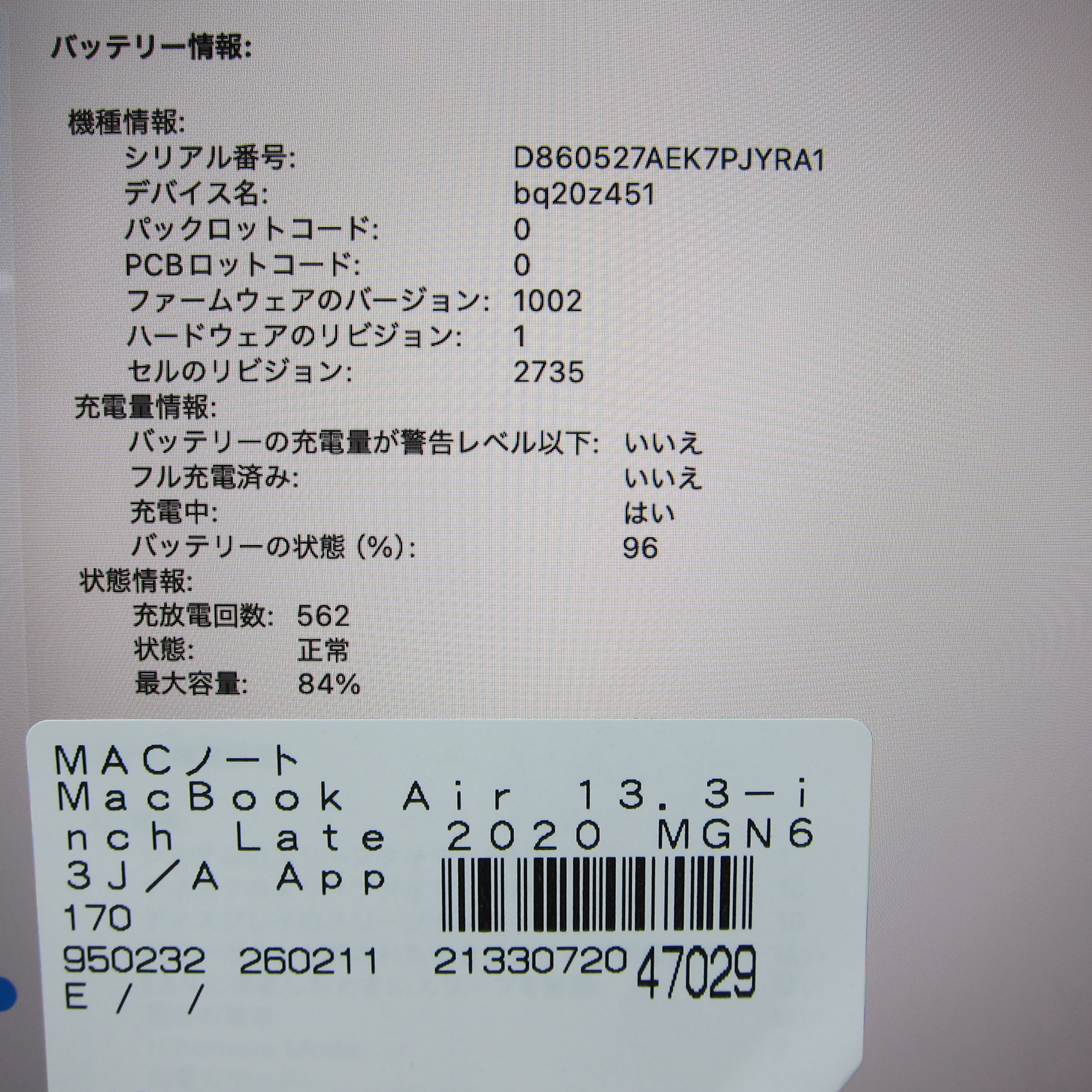〔中古品〕 MacBook Air 13.3-inch Late-2020 MGN63J/A Apple M1 8コアCPU_7コアGPU 8GB SSD256GB スペースグレイ 〔26.2 Tahoe〕 [グラフィック:オンボード/USキーボード]