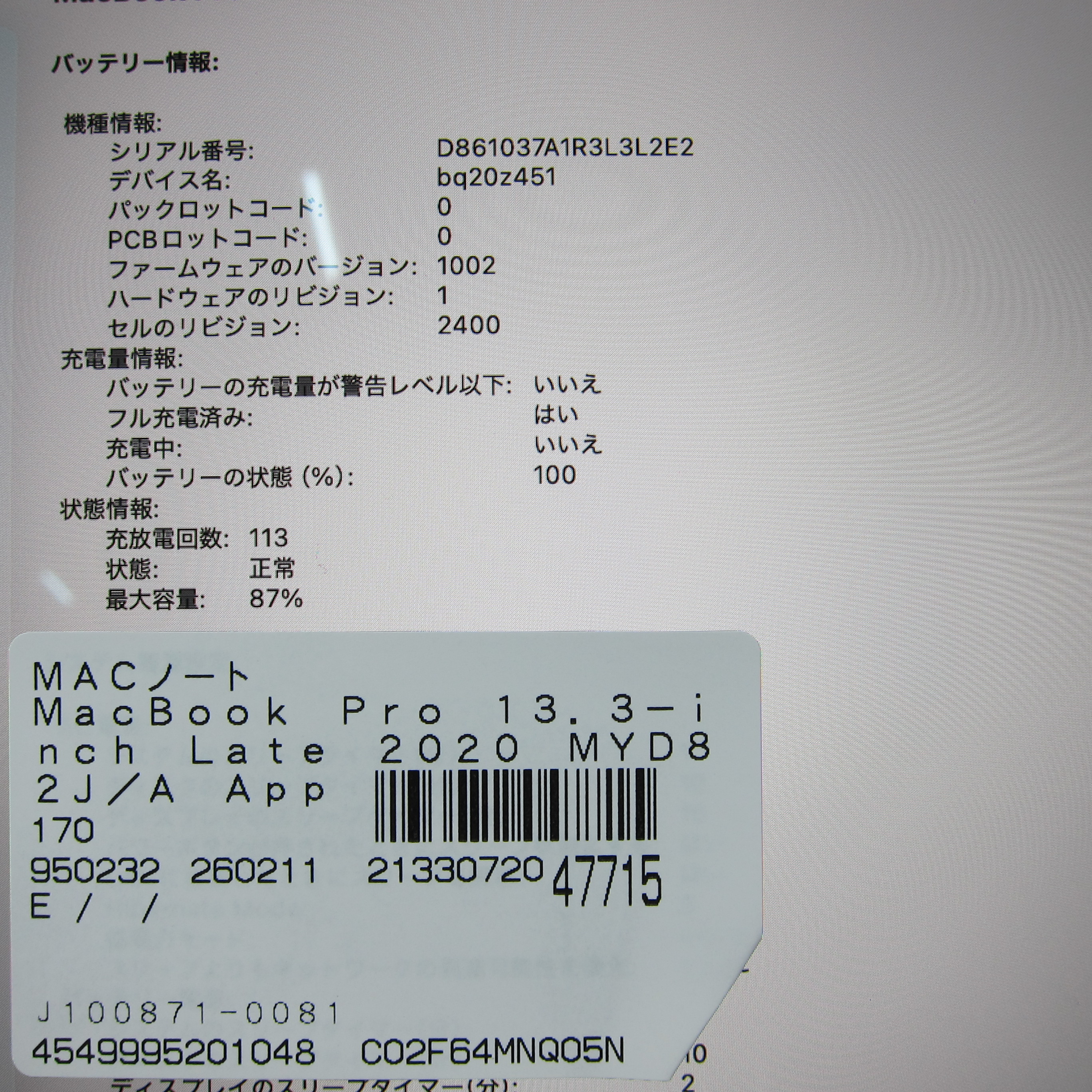 商品名 〔中古品〕 MacBook Pro 13.3-inch Late-2020 MYD82J/A Apple M1 8コアCPU_8コアGPU 16GB SSD256GB スペースグレイ 〔26.2 Tahoe〕 [グラフィック:オンボード/USキーボード]