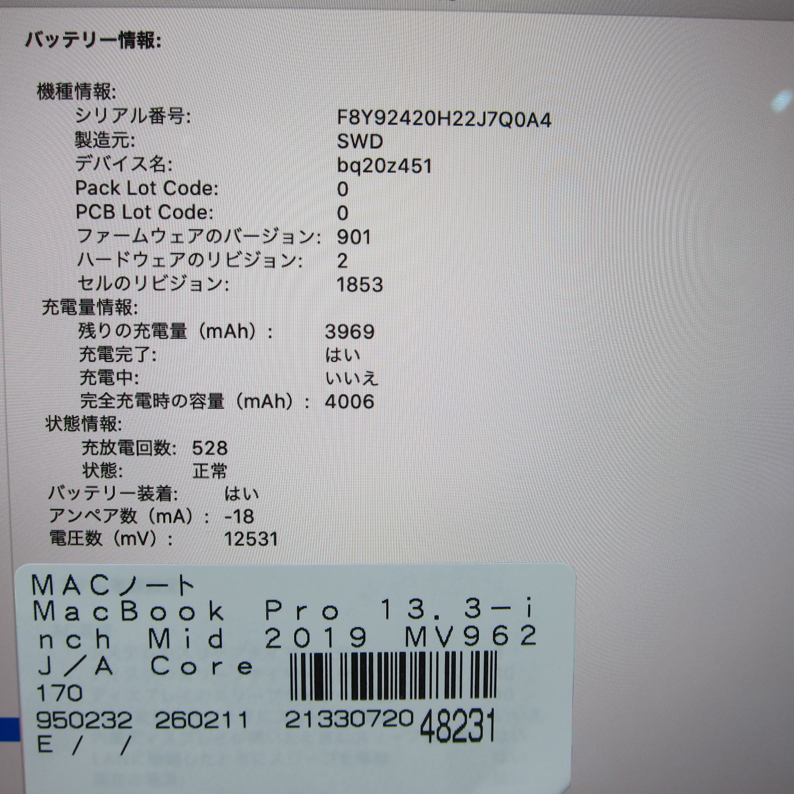 〔中古品〕 MacBook Pro 13.3-inch Mid-2019 MV962J/A Core_i7 2.8GHz 16GB SSD256GB スペースグレイ 〔10.15 Catalina〕 [グラフィック:Intel Iris Plus Graphics 655(CPU内蔵)/JISキーボード]