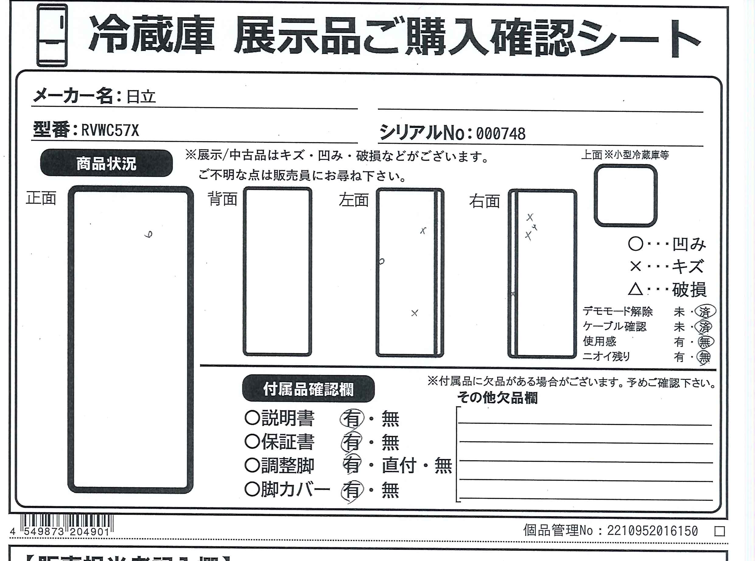 中古商品ランクについて 付属品・商品状態について 〔付属品〕説明書、調節脚×2、脚カバー、クッション×2、小物ケース(卵スタンド付き)、給水タンク、製氷スコップ、アルミトレイ