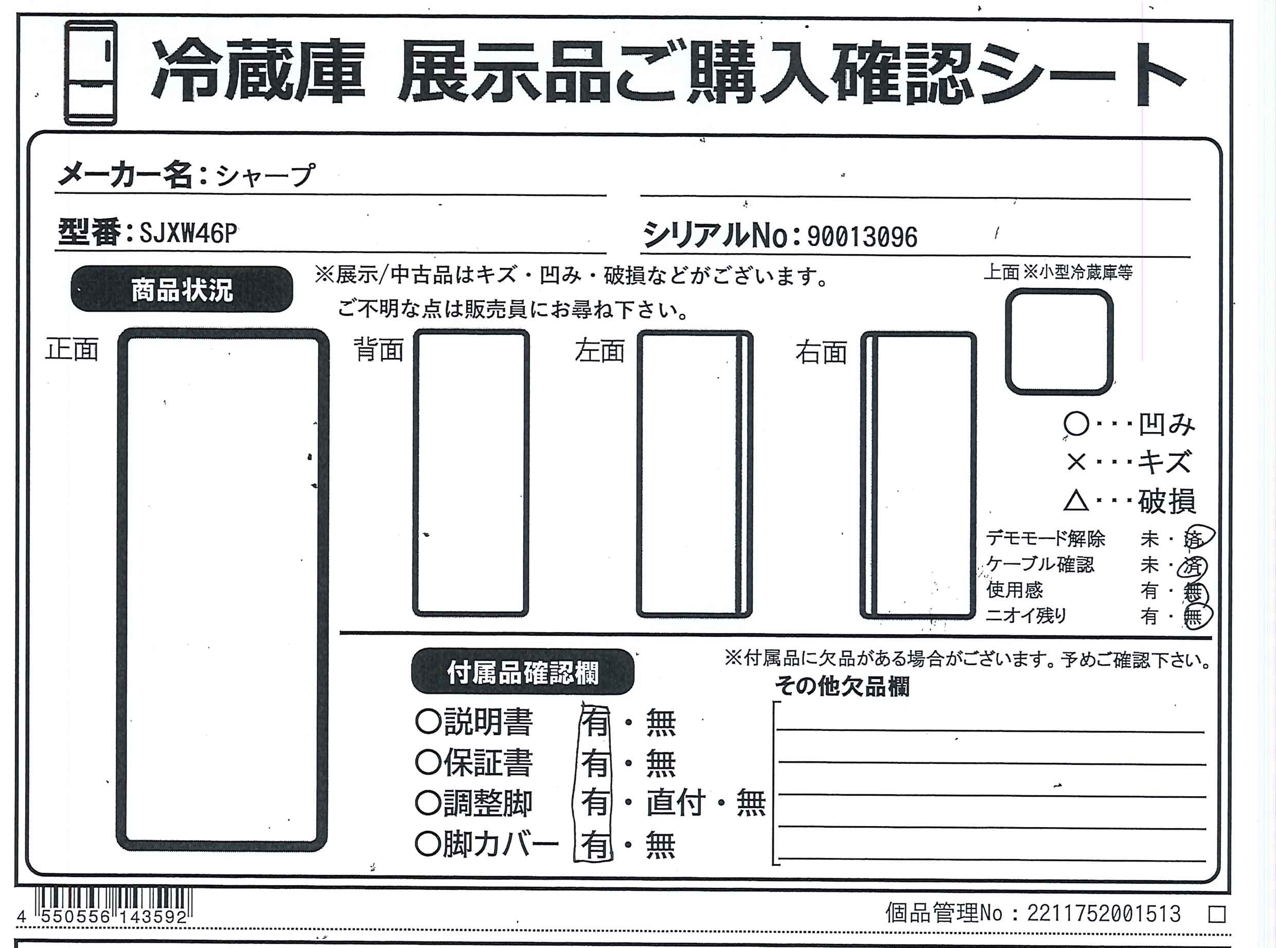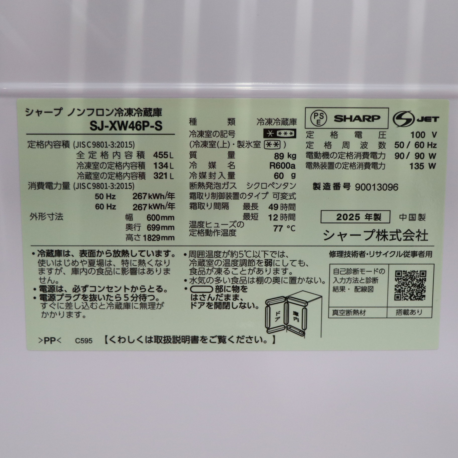 〔展示品〕 両開き455L冷蔵庫 カームマットシルバー SJ-XW46P-S [幅60cm /455L /5ドア /左右開きタイプ]