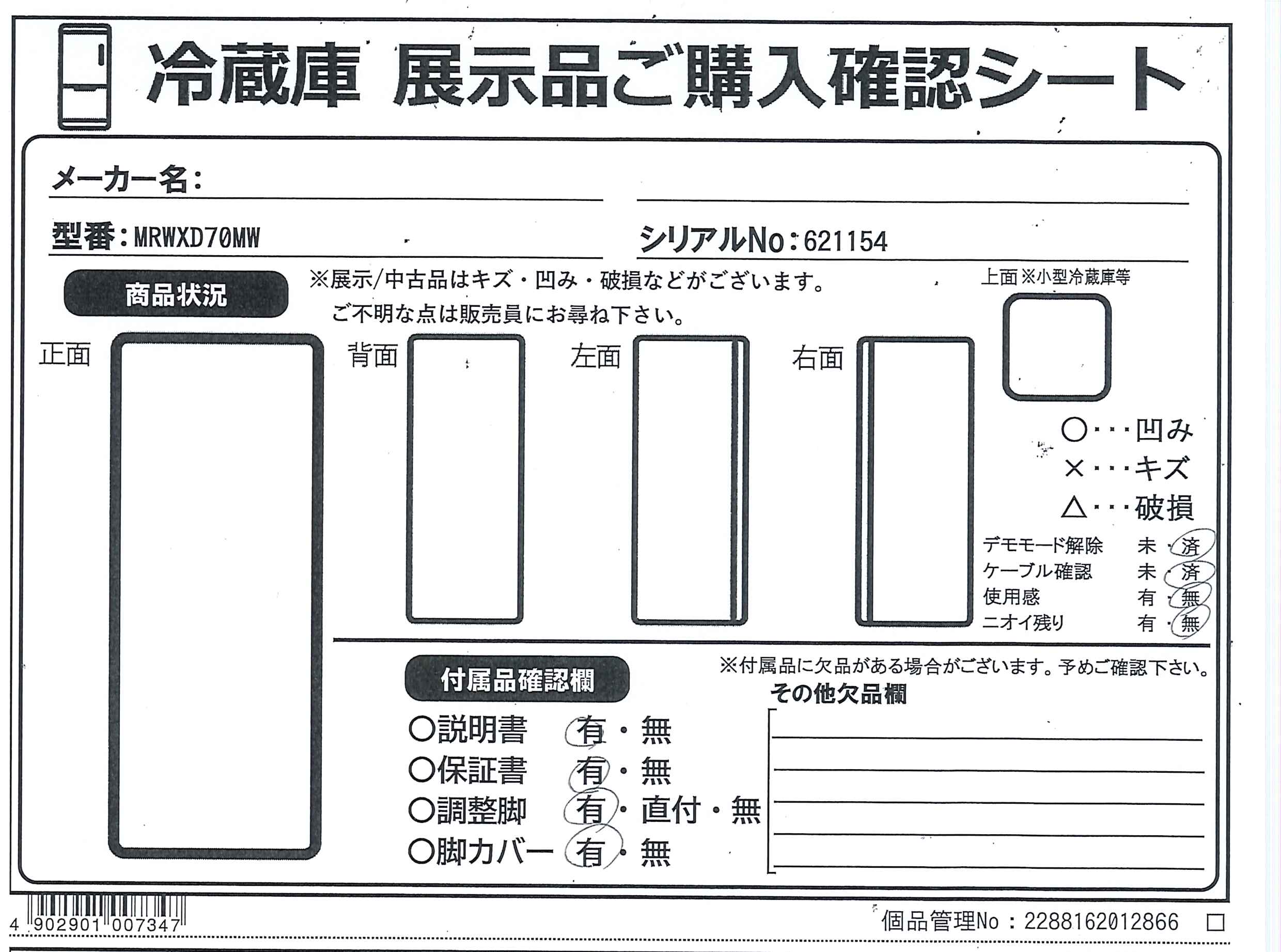 中古商品ランクについて 付属品・商品状態について 〔付属品〕説明書、ガラスシェルフ(上)、ガラスシェルフ(中)、ガラスシェルフ(下)、仕切り、ガラスシェルフ(前)、ガラスシェルフ(奥)、ワイドチルドケースフタ、ワイドチルドケース、氷点下ストッカーケース、給水タンク(カルキクリーンフィルターつき)、チェンジポケット(大)×2、チェンジポケット(小)×2、フリータマゴケース、タマゴトレイ、ボトルポケット(大)、ボトルポケット(小)、フリーケース(小)、ストッパー、製氷皿、貯氷箱、防音マット、アイスサーバー、瞬冷凍室ケース、アルミトレイ、フリージングケース(上)、フリージングケース(下)、野菜ケース、スライドケース、野菜ケース仕切り、脚カバー、調整脚用工具セット、調整脚×2