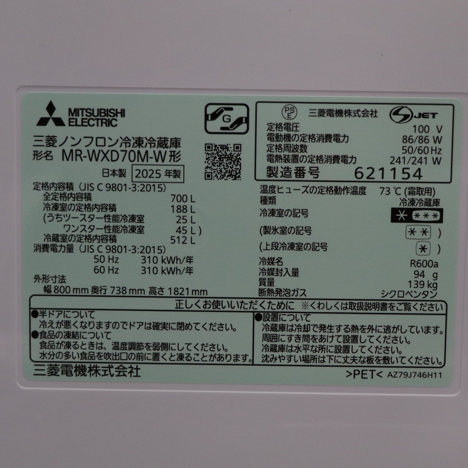 〔展示品〕 冷蔵庫 置けるスマート大容量 WXDシリーズ(プレミアムフレンチモデル) グランドリネンホワイト MR-WXD70M-W [幅80cm /700L /6ドア /観音開きタイプ /2025年]