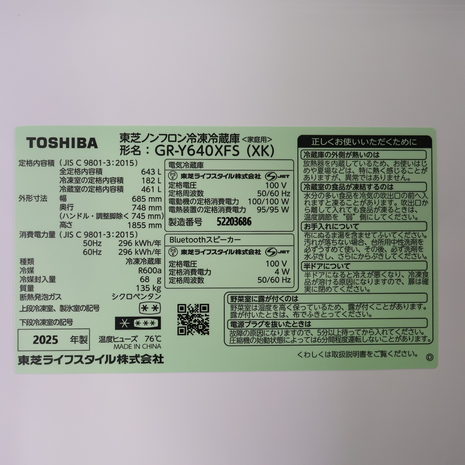 商品名 〔展示品〕 冷蔵庫 VEGETA(ベジータ)XFSシリーズ オブシディアンブラック GR-Y640XFS-XK [幅68.5cm /643L /6ドア /観音開きタイプ /2025年]