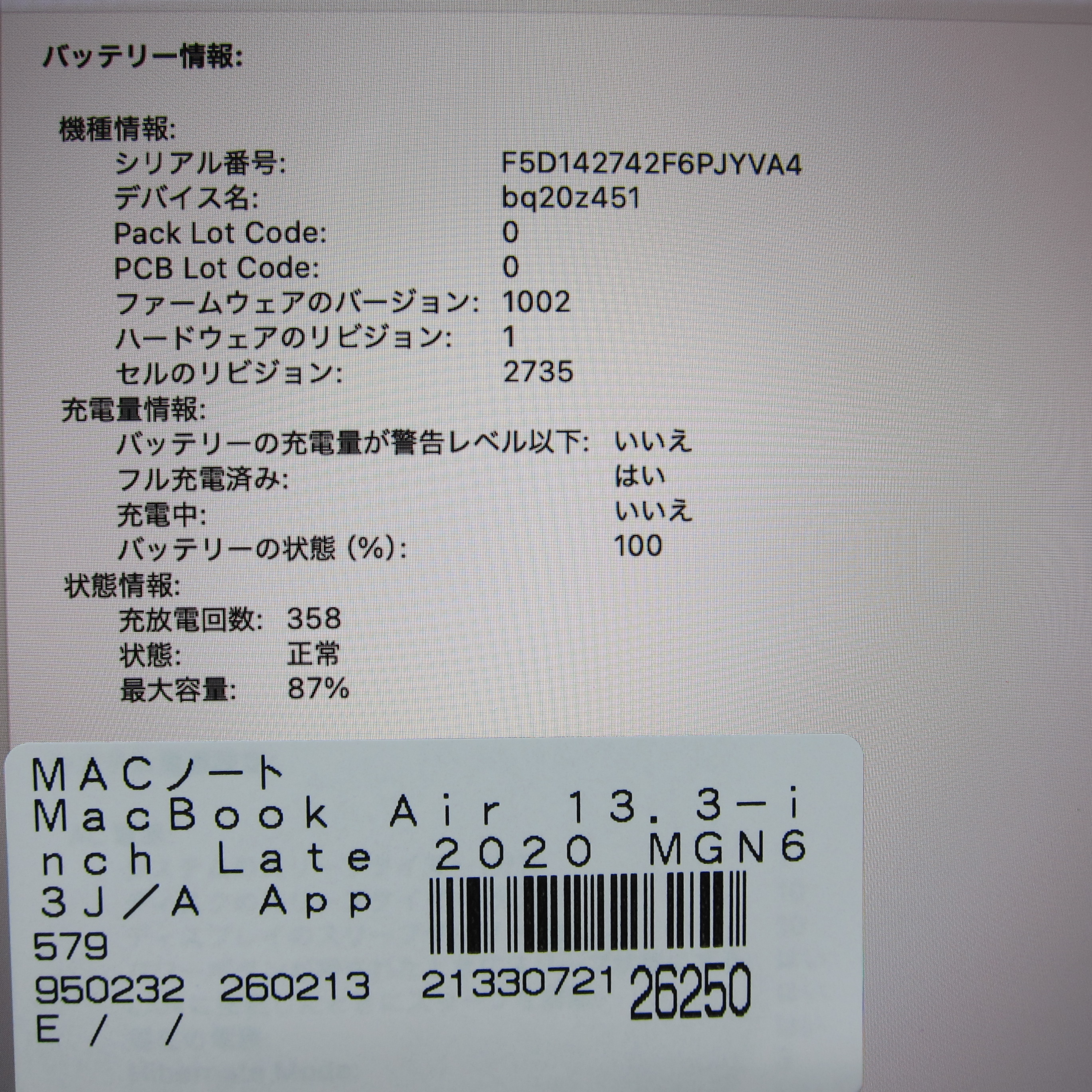 〔中古品〕 MacBook Air 13.3-inch Late-2020 MGN63J/A Apple M1 8コアCPU_7コアGPU 8GB SSD256GB スペースグレイ 〔15.3 Sequoia〕 [グラフィック:オンボード/JISキーボード]