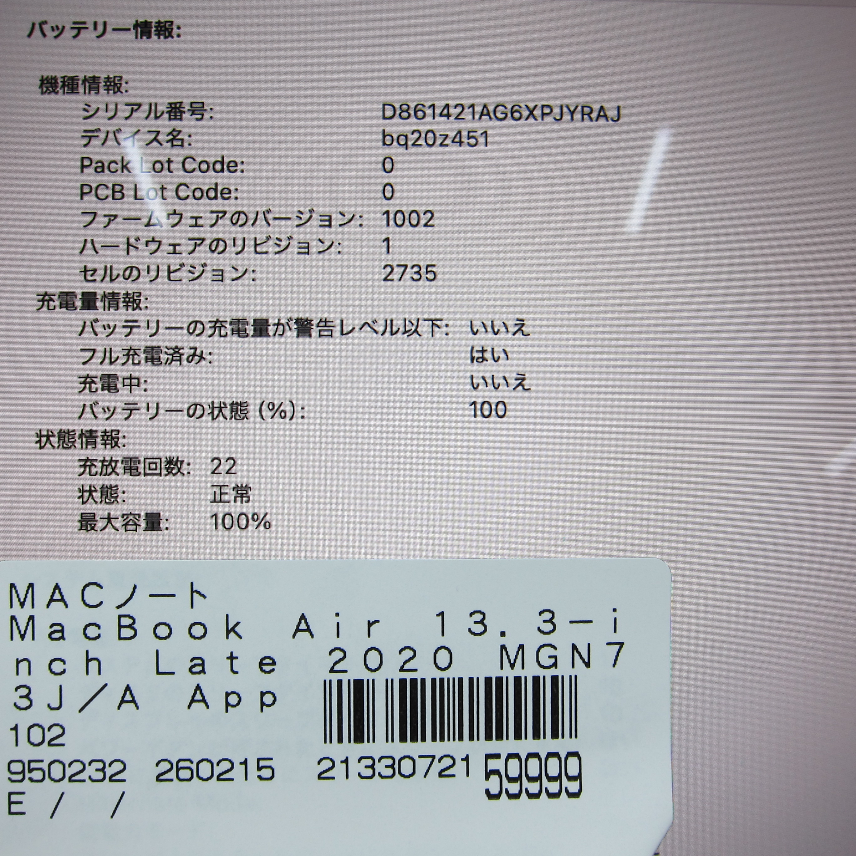 〔中古品〕 MacBook Air 13.3-inch Late-2020 MGN73J/A Apple M1 8コアCPU_8コアGPU 16GB SSD512GB スペースグレイ 〔15.3 Sequoia〕 [グラフィック:オンボード/USキーボード]