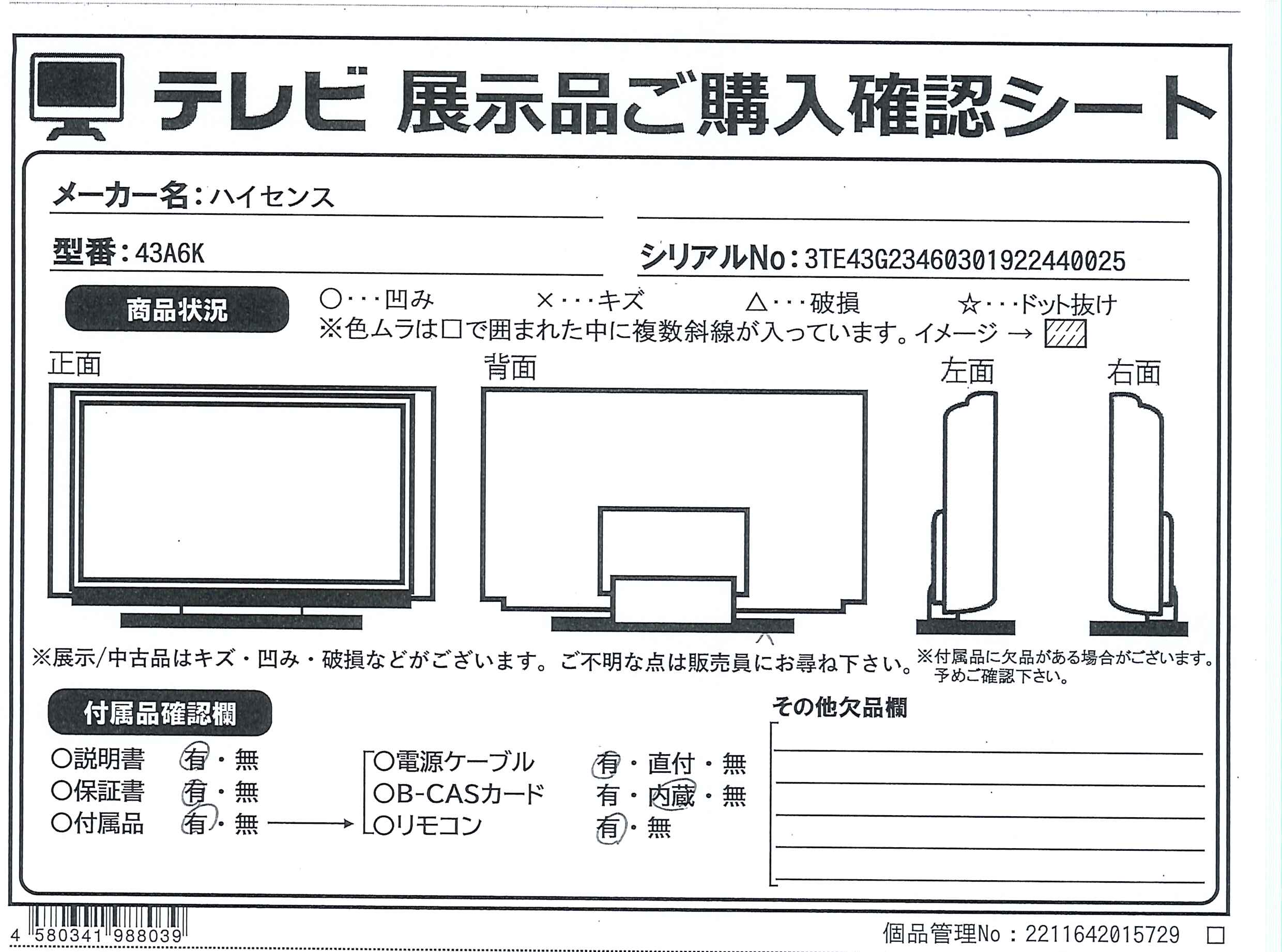 中古商品ランクについて 付属品・商品状態について 〔付属品〕説明書、電源コード、単三型乾電池×2、リモコン、転倒防止ベルト一式、スタンド×2、ネジ×4