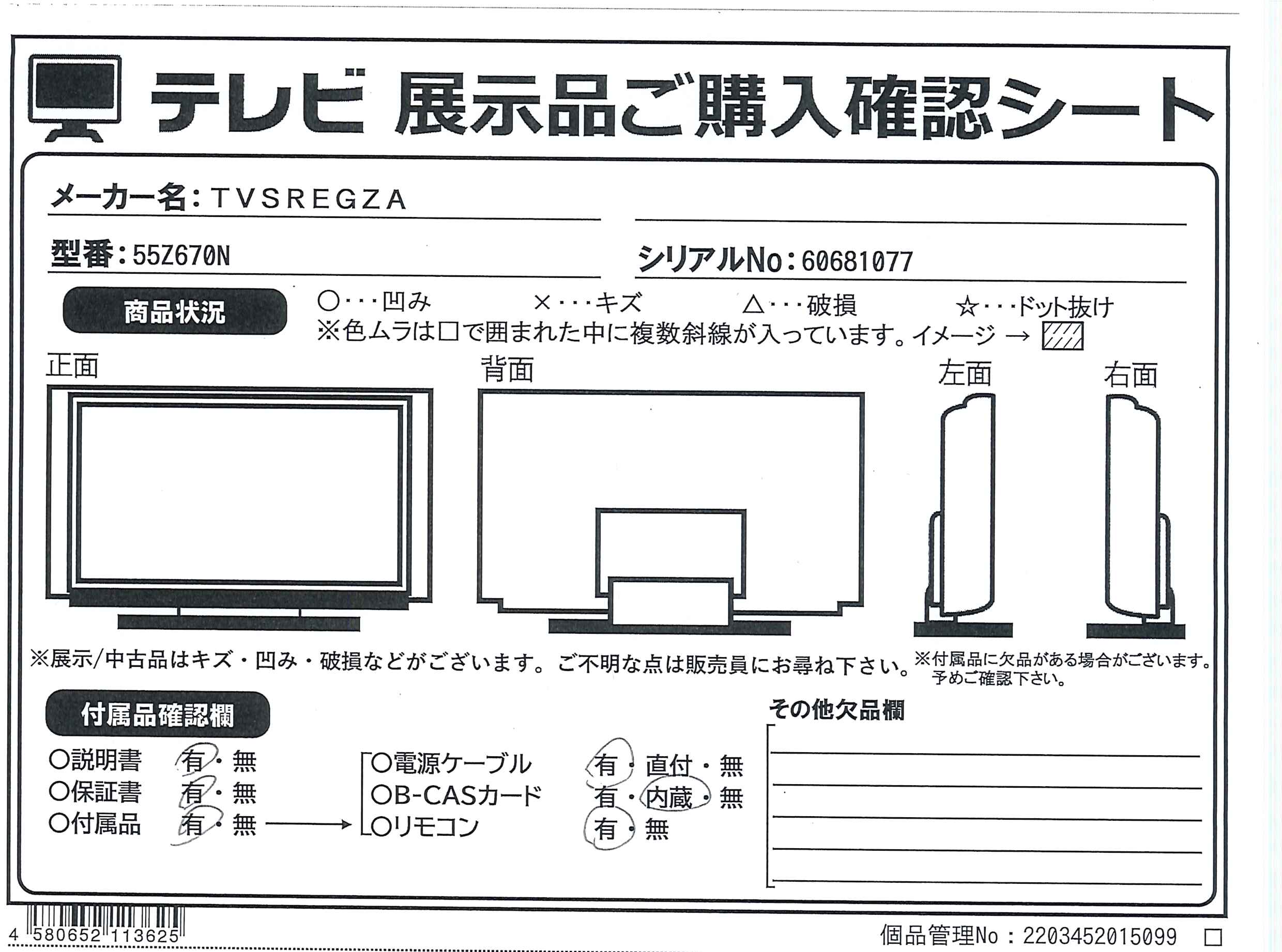 中古商品ランクについて 付属品・商品状態について 〔付属品〕取扱説明書、リモコン、リモコン用単4形乾電池×2、電源コード、スタンドベース、スタンド支柱、スタンド組立・取付ネジ×8本、転倒防止バンド一式、コードクランプ、スタンドカバー