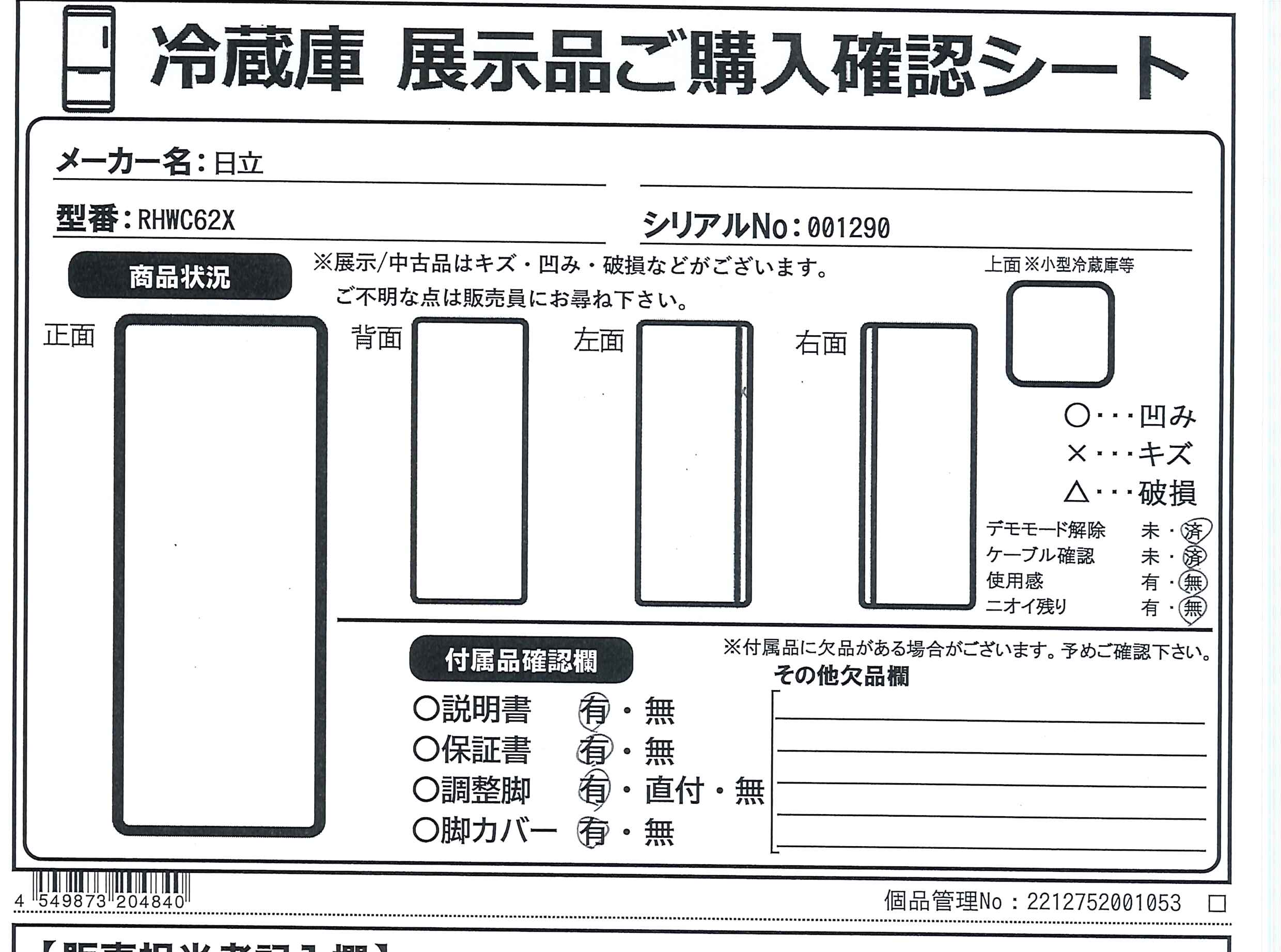 中古商品ランクについて 付属品・商品状態について 〔付属品〕説明書、脚カバー、調節脚×2、クッション×2、小物ケース、タマゴトレイ、給水タンク一式、製氷スコップ、大型アルミトレイ(冷凍室下段)